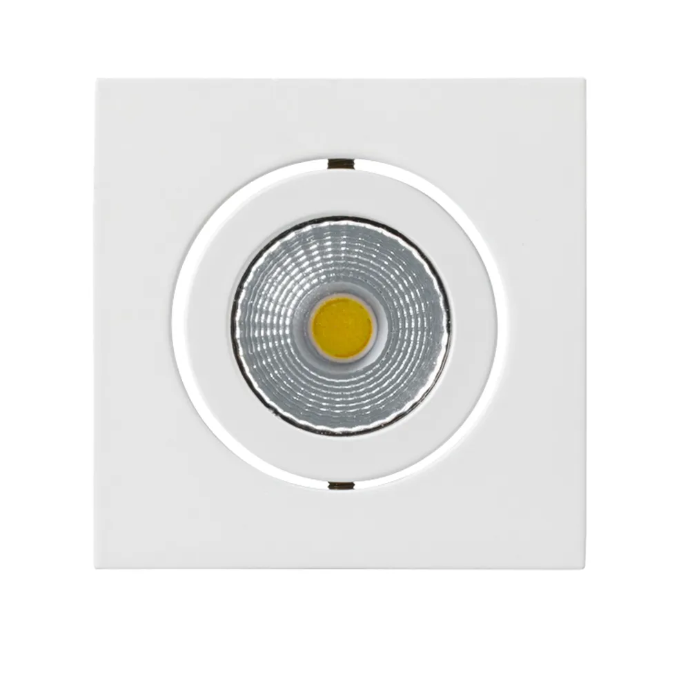 Врезной квадратный мебельный светильник 5Вт, корпус белый алюминий. Цвет ТЕПЛЫЙ БЕЛЫЙ 3000K. Светодиод 1х5W Bridgelux. CRI>80, Св.поток 350-400лм, наклоняемая ось, угол 25°. Питание 180-240VAC, 5Вт, 400mA 11-13V, драйвер в комплекте. Размеры 50x50x50 мм, врезное отверстие d42 мм.