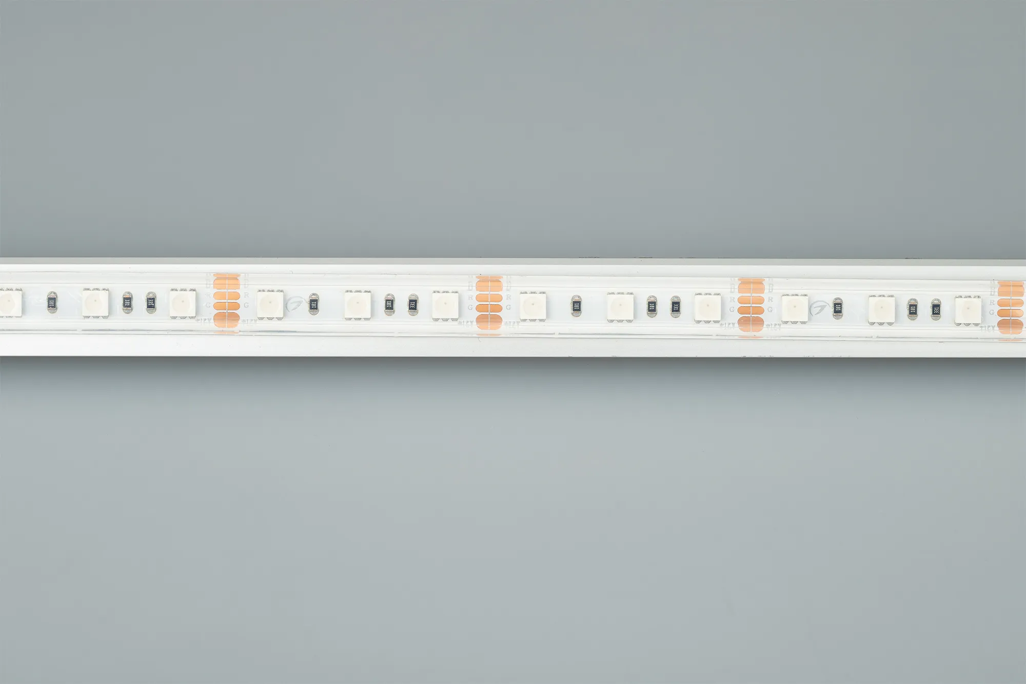 Герметичная лента IP67 (силикон, экструзия), светодиоды smd 5060, 60шт/м (300шт на 5м), белая плата 10мм, скотч 3М. Цвет Мультицвет R/G/B. Питание 12V, мощность 14.4 Вт/м (72 Вт на 5м), угол 120°. Размеры 5000х12x5мм. Мин.отрезок 50мм, 3 светодиода. Цена за 1м.