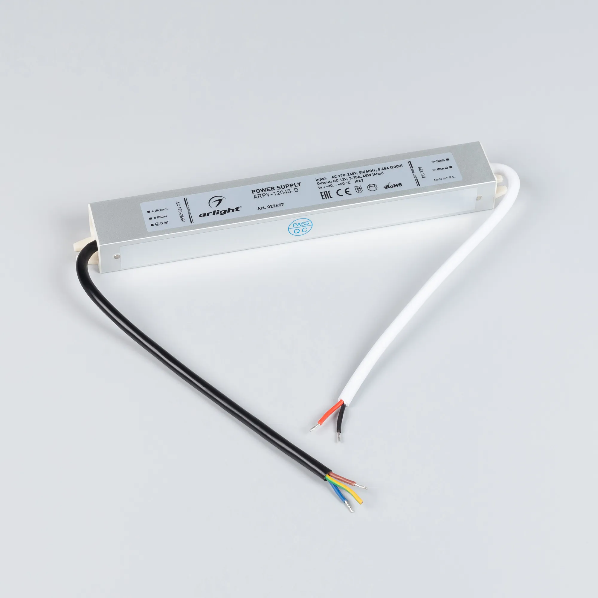 Источник напряжения с гальванической развязкой для светодиодных изделий. Входное напряжение 170-265 VAC. Выходные параметры: 12 В, 3,75 А, 45 Вт. Встроенный PFC >0,5. Герметичный алюминиевый корпус IP 67. Рабочая температура -30…+50C⁰. Габаритные размеры длина 217 мм, ширина 30 мм, высота 20 мм. Гарантийный срок 3 года.