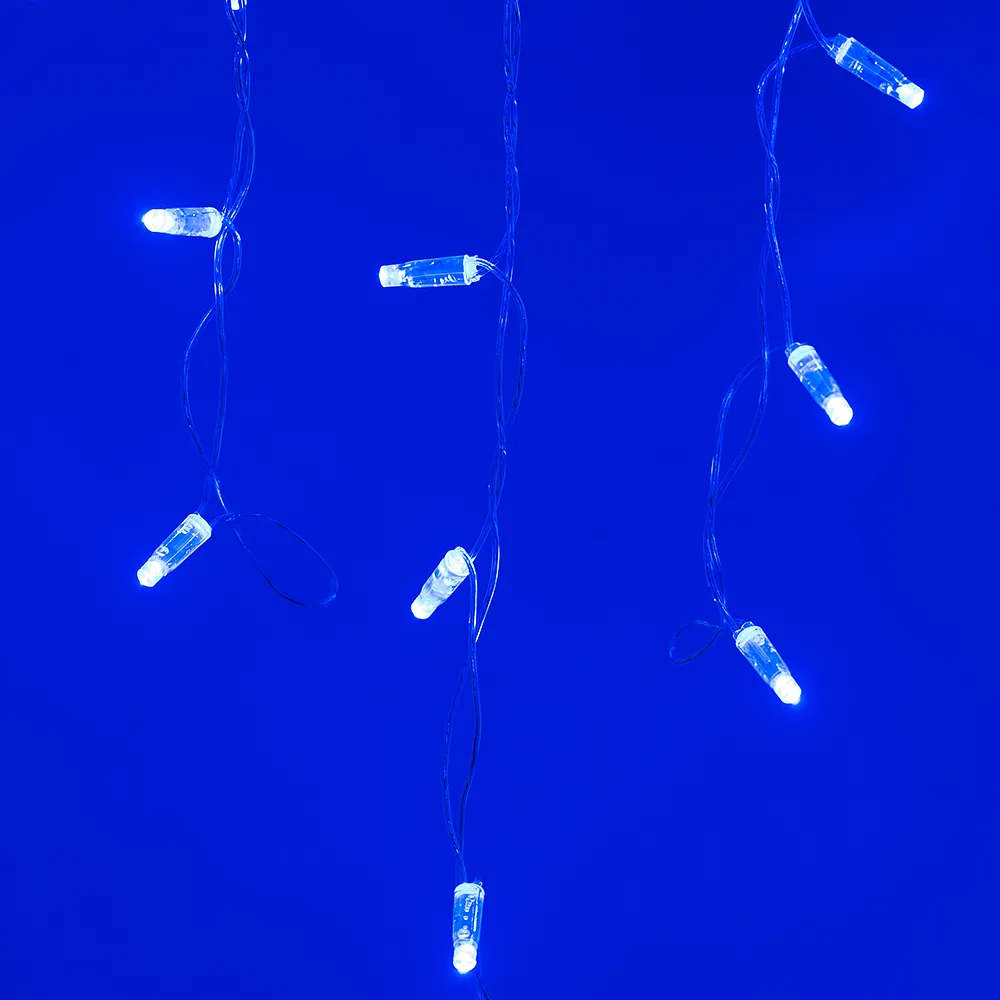 Светодиодная бахрома Classic. Размер 2400x600 мм (длина 2400 мм, по длине 24 нити высотой 200/600 мм). Количество светодиодов 88 шт размером 7 мм. Цвет свечения СИНИЙ, эффект постоянного свечения с резким световым рисунком (прозрачная вогнутая линза). Провод прозрачный, ПВХ. Питание 230 В, Мощность 6 Вт, защита IP65, применение на улице под навесом. Аксессуары для подключения приобретаются отдельно.