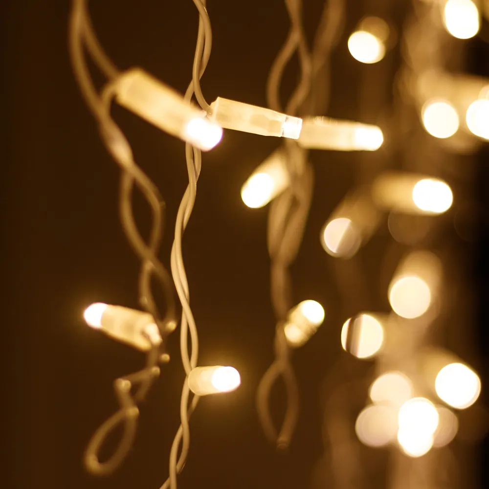 Светодиодная бахрома Classic. Размер 4000x600 мм (длина 4000 мм, по длине 24 нити высотой 200/600 мм). Количество светодиодов 128 шт размером 7 мм. Цвет свечения ТЕПЛЫЙ БЕЛЫЙ (3000 К), эффект постоянного свечения с резким световым рисунком (прозрачная вогнутая линза). Провод белый, каучук. Питание 230 В, Мощность 8 Вт, защита IP65, применение на улице под навесом. Аксессуары для подключения приобретаются отдельно.
