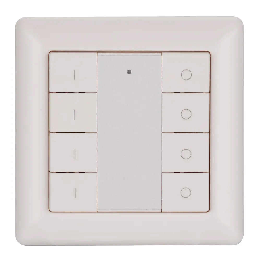 Встраиваемая кнопочная белая пластиковая панель для работы по протоколу DALI. Управление 4-мя группами. Установка номера первой группы выполняется переключателями на корпусе. Объекты управления: BROADCAST или группы 0-14 (15-я группа не управляется), 3 функции каждой группы (ВКЛ / ВЫКЛ / ДИММИРОВАНИЕ). Питание от шины DALI (4 мА). Стандартная рамка входит в комплект поставки.