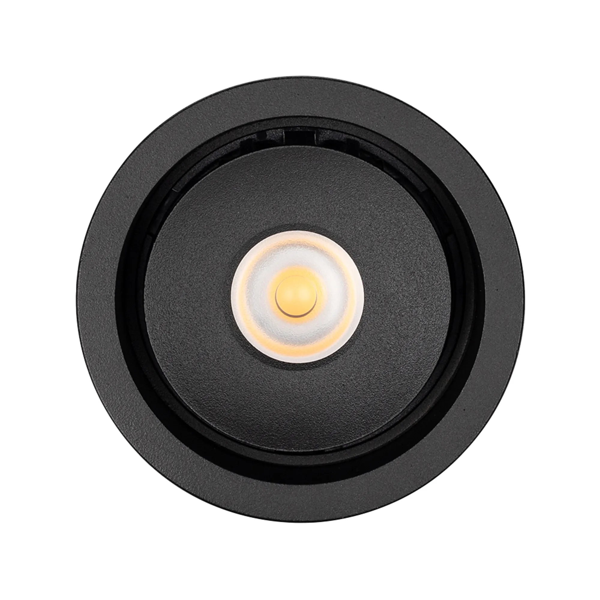 Встраиваемый поворотный светильник для потолка. Мощность 9W, цвет ДНЕВНОЙ 4000K, св.поток 630лм, угол 45°, RA>90. Корпус черный. Питание AC180-240V. Размеры DxH Ø78x90мм. Установка в отверстие Ø70мм. Драйвер в комплекте (30-45V, 220mA).