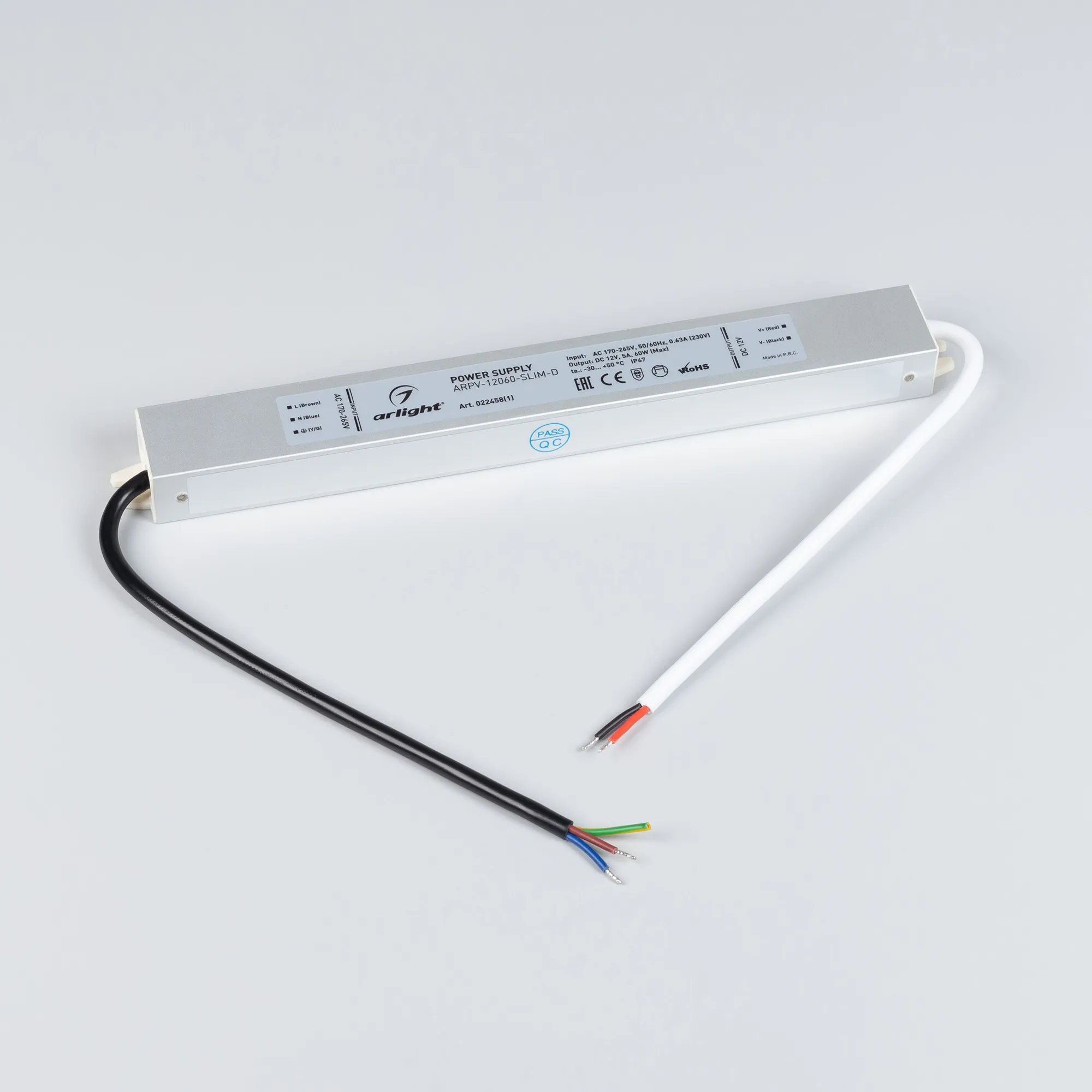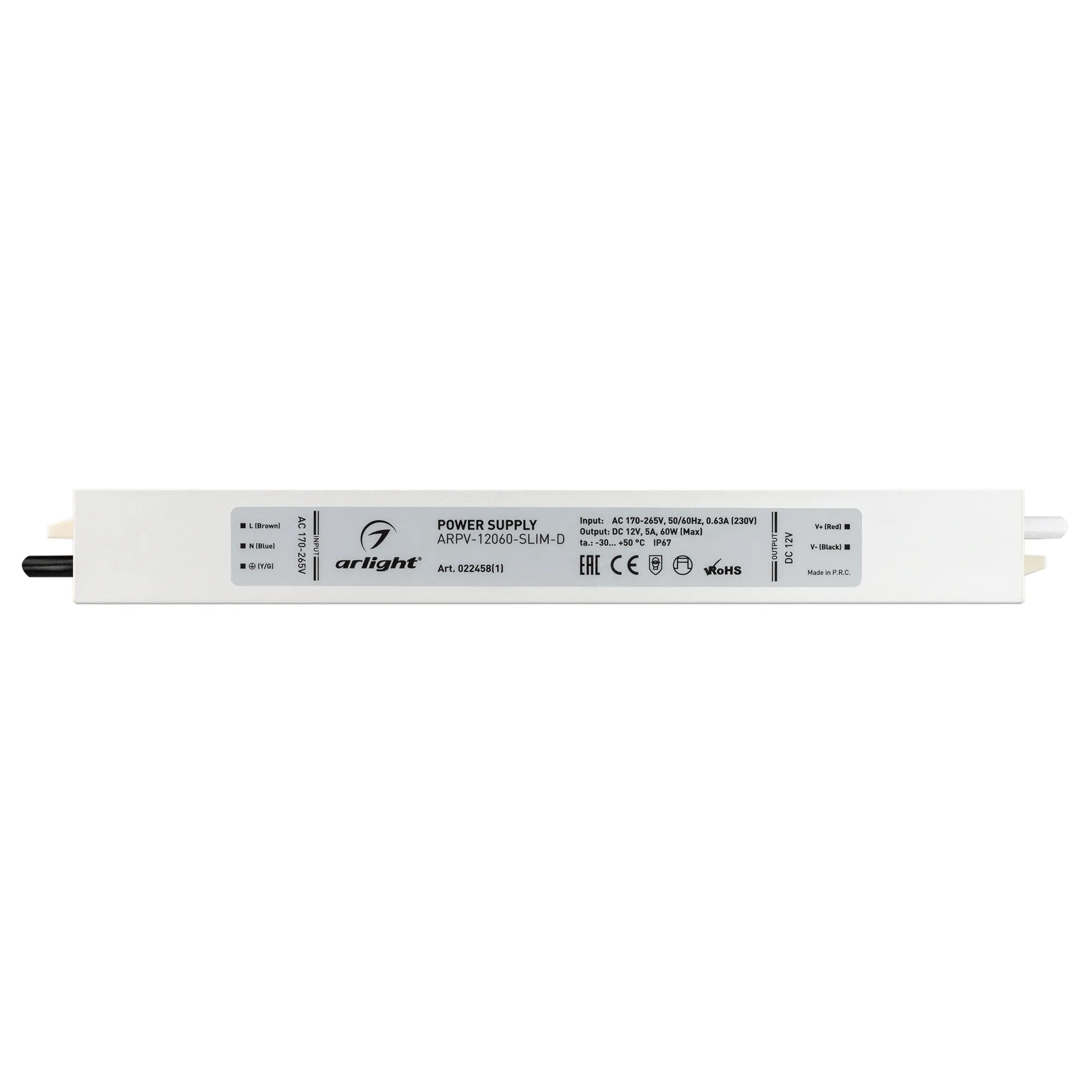 Источник напряжения с гальванической развязкой для светодиодных изделий. Входное напряжение 170-265 VAC. Выходные параметры: 12 В, 5 А, 60 Вт. Встроенный PFC >0,5. Герметичный алюминиевый корпус IP 67. Рабочая температура -30…+50C⁰. Габаритные размеры длина 257 мм, ширина 30 мм, высота 20 мм. Гарантийный срок 3 года.