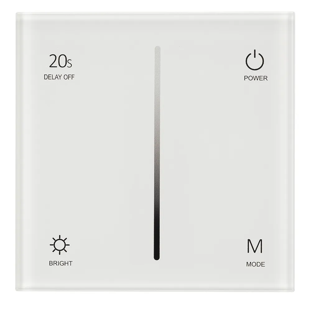 Встраиваемая сенсорная стеклянная панель 2.4 ГГц, цвет белый. Для управления одноцветными источниками света (TRIAC). Управление яркостью с помощью сенсорной полосы. Питание/рабочее напряжение 100-240VAC, 1 зона управления. Габариты 86х86х35 мм.