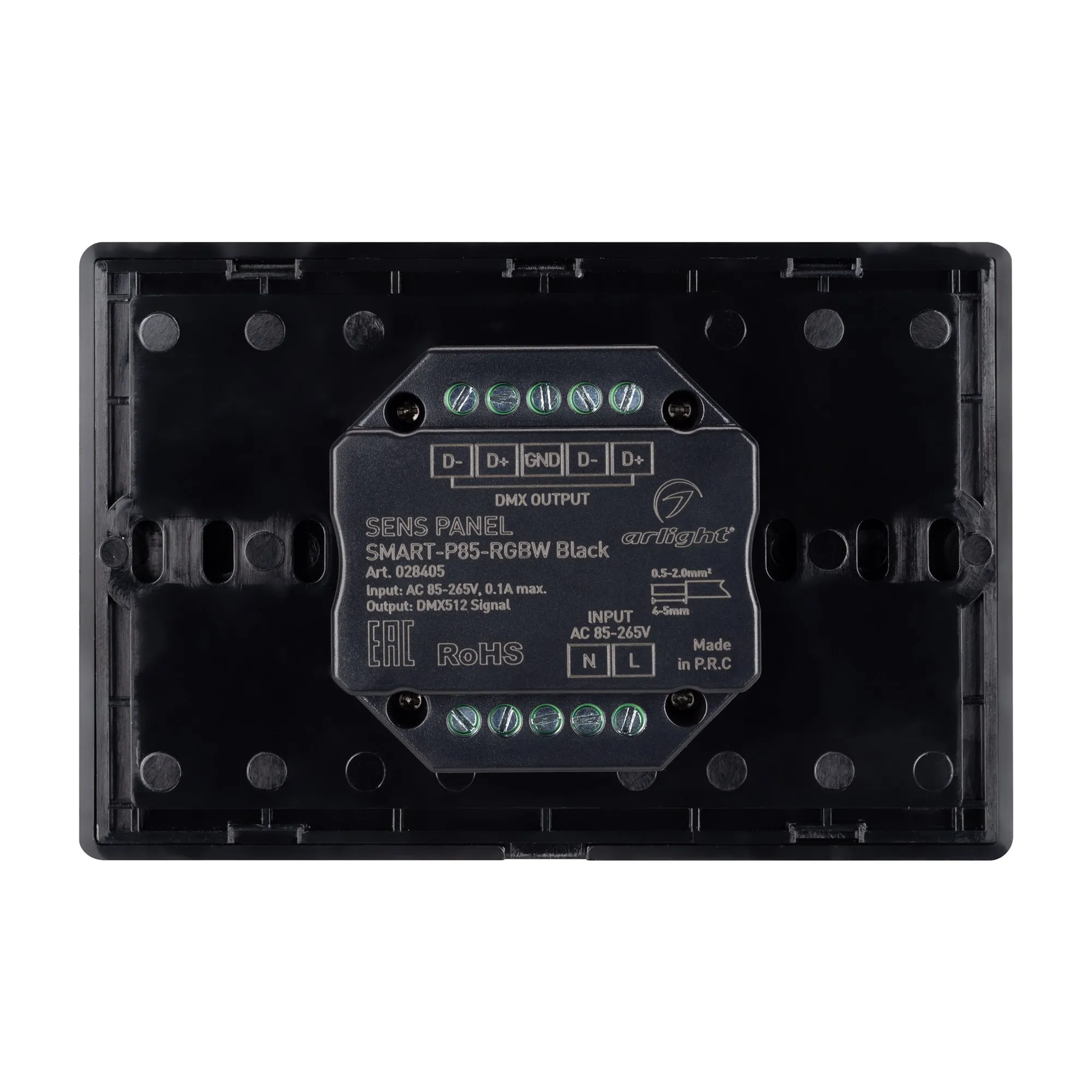 Встраиваемая сенсорная панель 2.4 ГГц, цвет чёрный. Итальянский стандарт. Материал - стекло. Для управления RGBW источниками света (ШИМ), 4 зоны управления. Функция управления DMX512 устройствами. Питание/рабочее напряжение AC 85-265V. Габариты 120х80х37 мм, устанавливается в стандартный подрозетник. Панель совместима с контроллерами серии SMART.