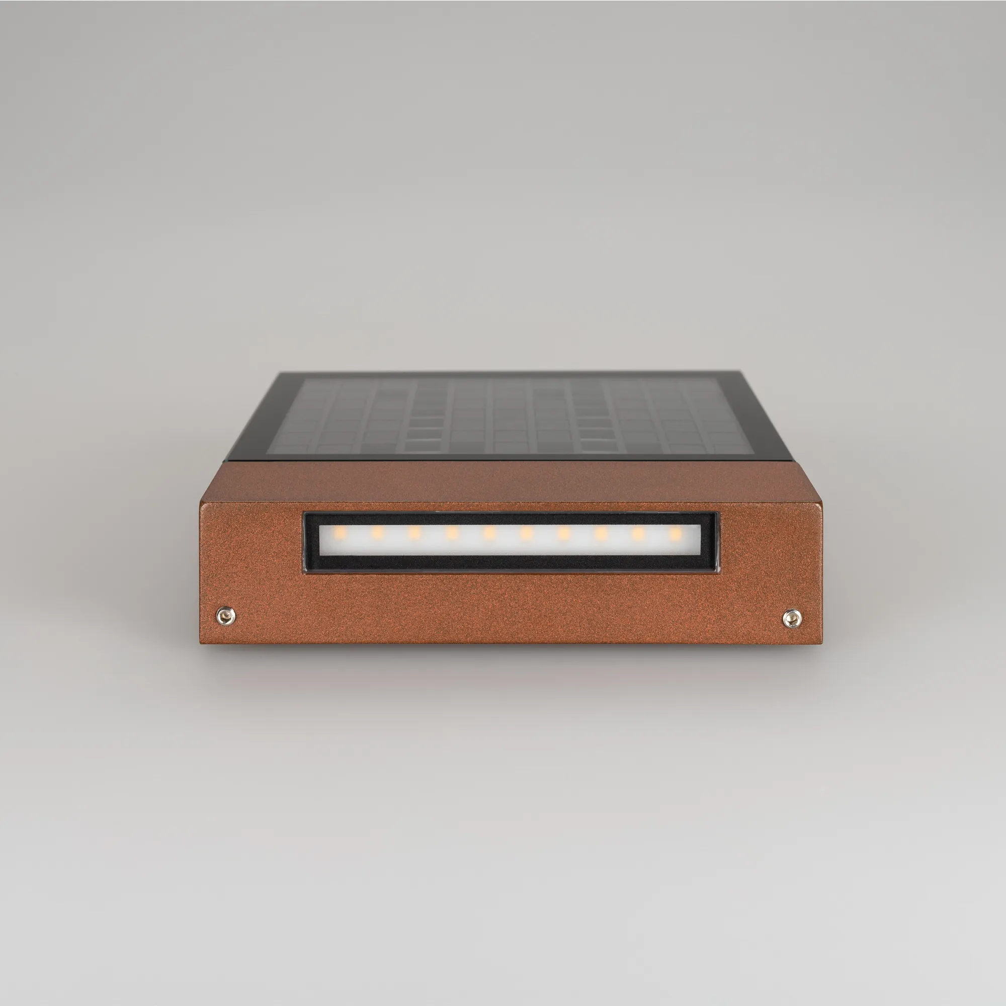 Настенный светильник-указатель. Цвет ТЕПЛЫЙ БЕЛЫЙ 3000К, светодиоды 3Вт (150лм). Влагозащищенный корпус IP54 - коричневый алюминий, экран из закаленного стекла. Питание 230В, мощность 3Вт. Размеры ДхШхВ - 150x200x36мм.