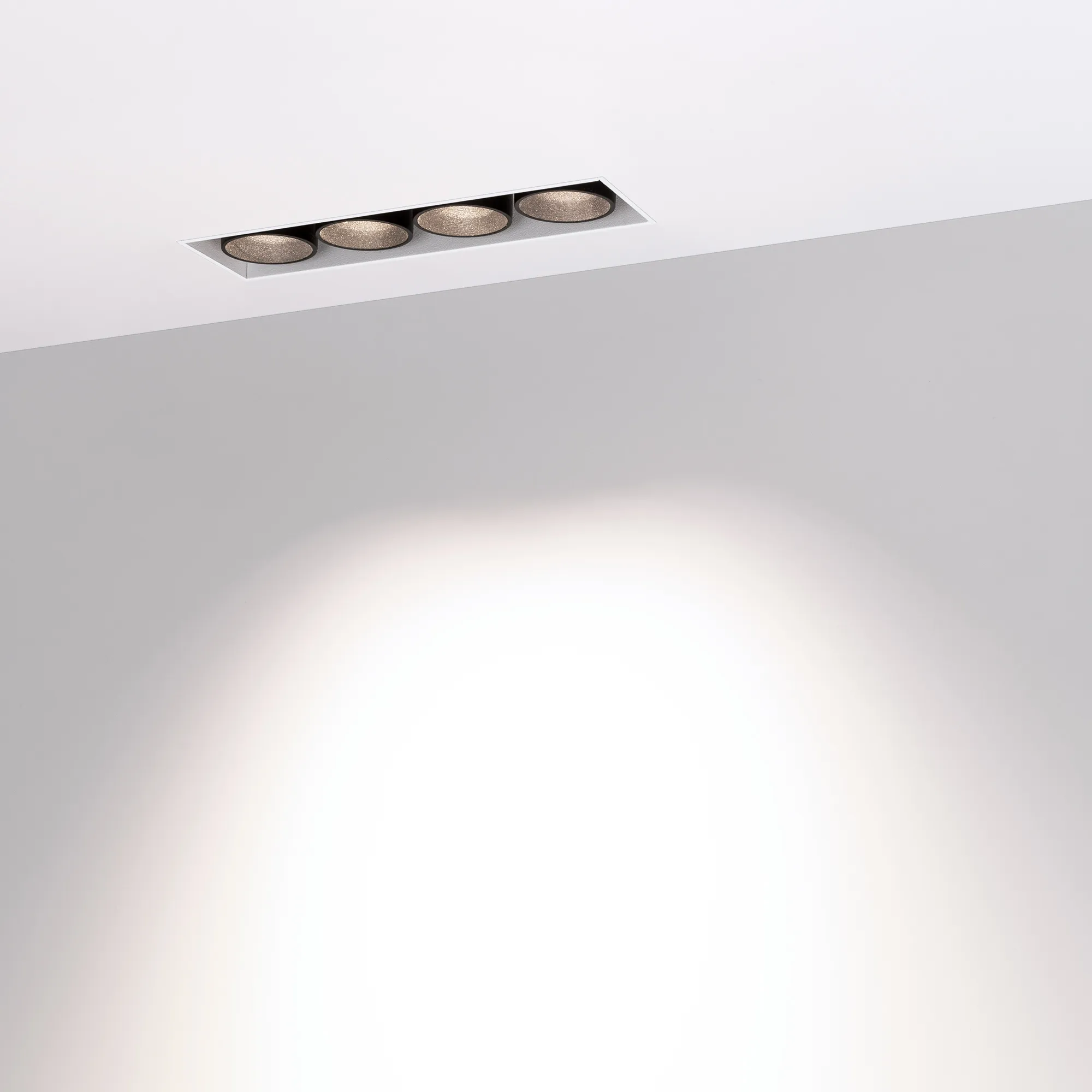 Встраиваемый безрамочный светильник под шпаклевку. Мощность 10 Вт, св. поток 750 лм, 75 лм/Вт, дневной 4000 K, CRI>98, угол 30°, напряжение питания 230 В. Белый прямоугольный корпус из алюминия, экран PMMA, степень защиты IP20. Размер: длина 127 мм, ширина 38 мм (с фланцем 80 мм), высота 53 мм. Монтаж встраиваемый, установочное отверстие длина 130 мм, ширина 50 мм. Драйвер 9-14 В, 700 мА, пульсация <1%.
