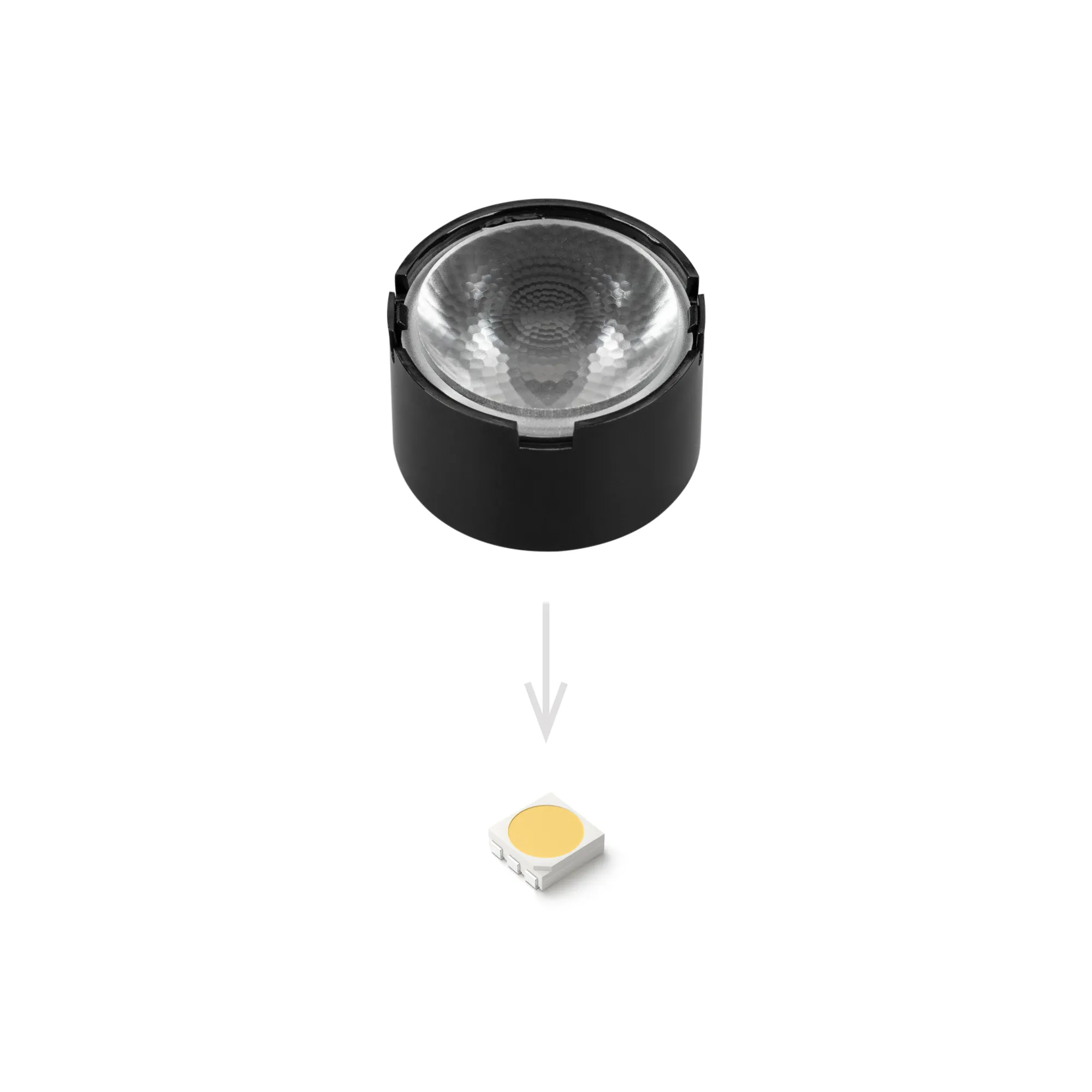 Поставка под заказ от 1800 шт. Одиночная линза со съемным холдером черного цвета для светодиодов SMD: 2525, 2835, 3030, 3535, 5050. Угол обзора: вертикальный 12°, прозрачная микропризма. Материал PMMA. Диаметр 19.5 мм, высота 11.76 мм.