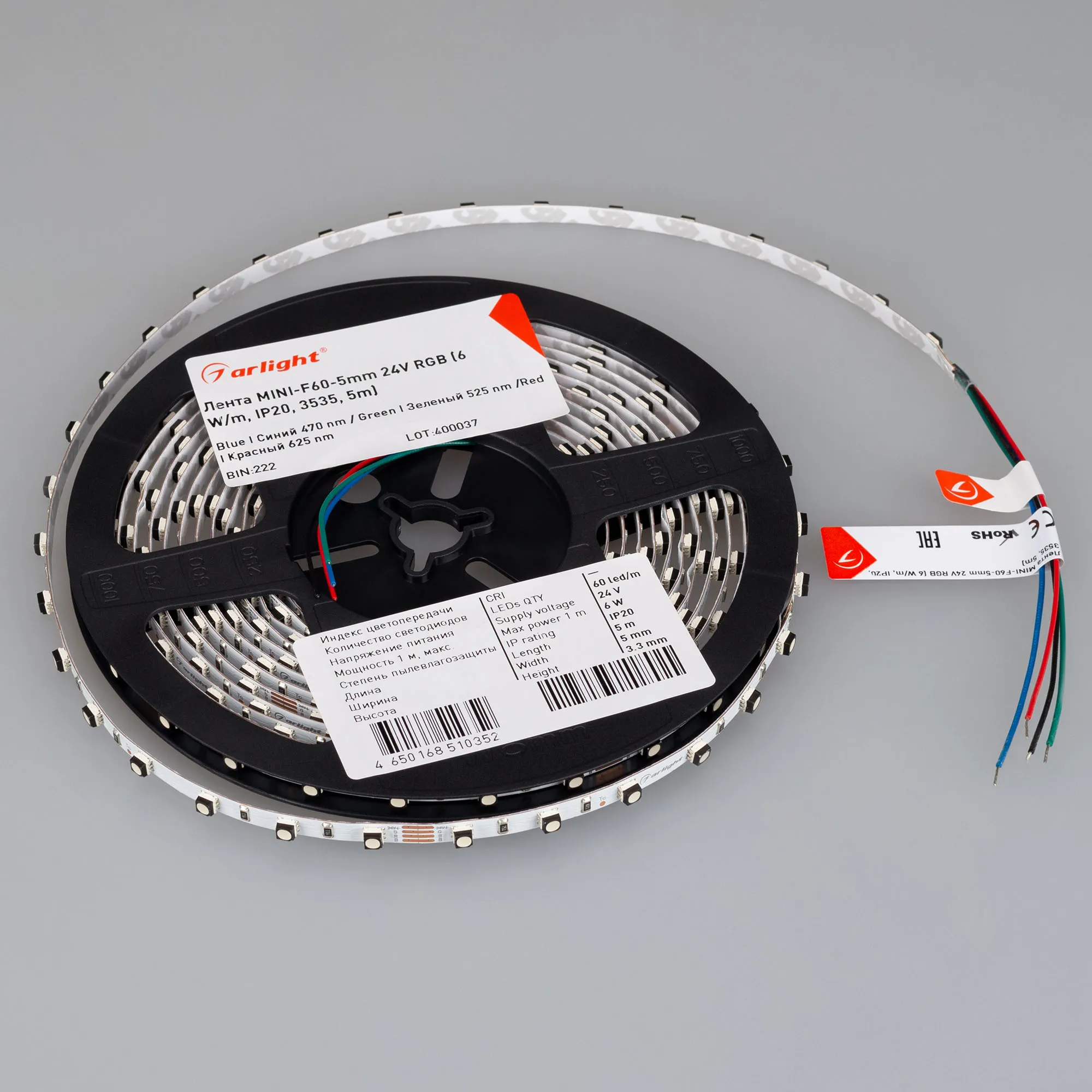 Мультицветная лента MINI серии F60. Светодиоды SMD 3535, 60 шт/м, белая плата шириной 5 мм, скотч 3M. Цвет RGB. Питание 24 В, мощность 6 Вт/м (30 Вт на 5 м), угол 120°. Размеры 5000x5x3.3 мм. Мин. отрезок 100 мм, 6 светодиодов. Цена за 1 м.
