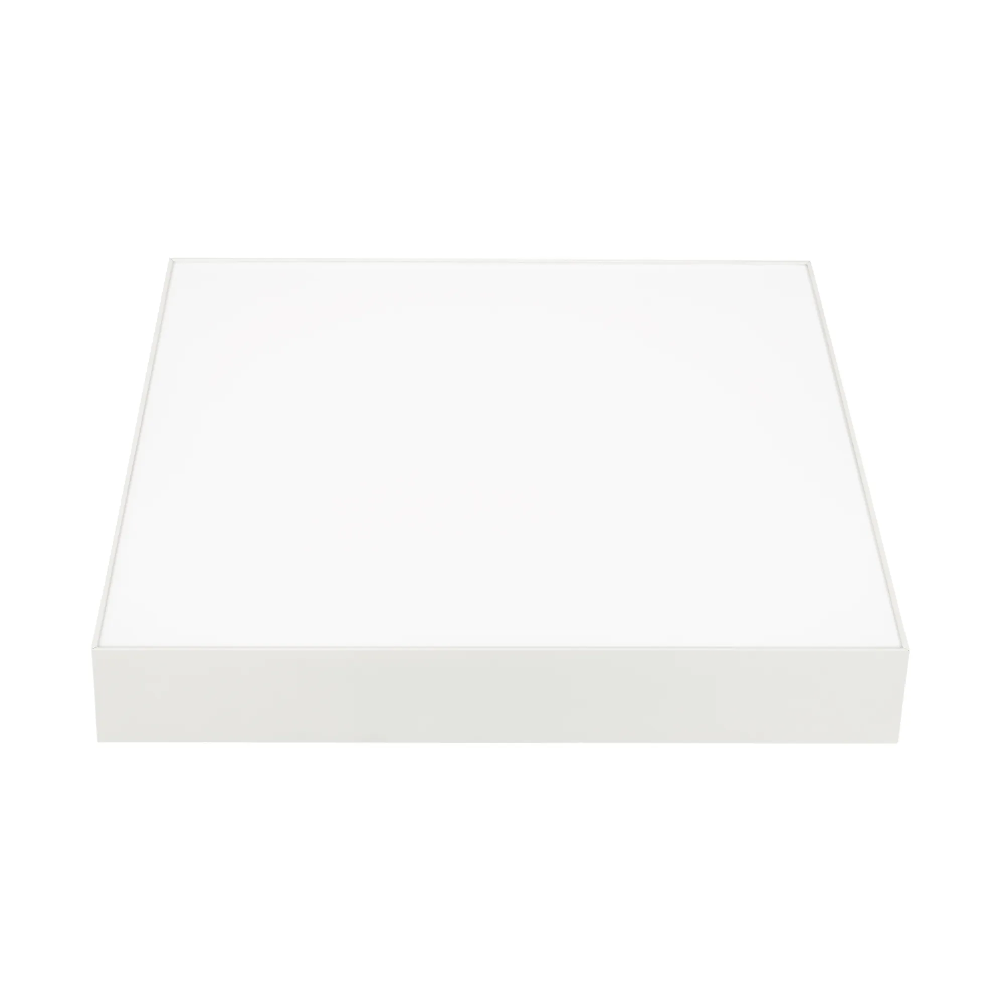 Накладной светильник. Мощность 40 Вт, св. поток 2590-3200 лм, 80 лм/Вт, теплый 3000 K, CRI>90, угол 120°, напряжение питания 230 В. Белый квадратный корпус из алюминия, экран PC, степень защиты IP40. Размер: длина 400 мм, ширина 400 мм, высота 64 мм. Монтаж накладной. Драйвер 27-40 В, 1000 мА, пульсация <5%.