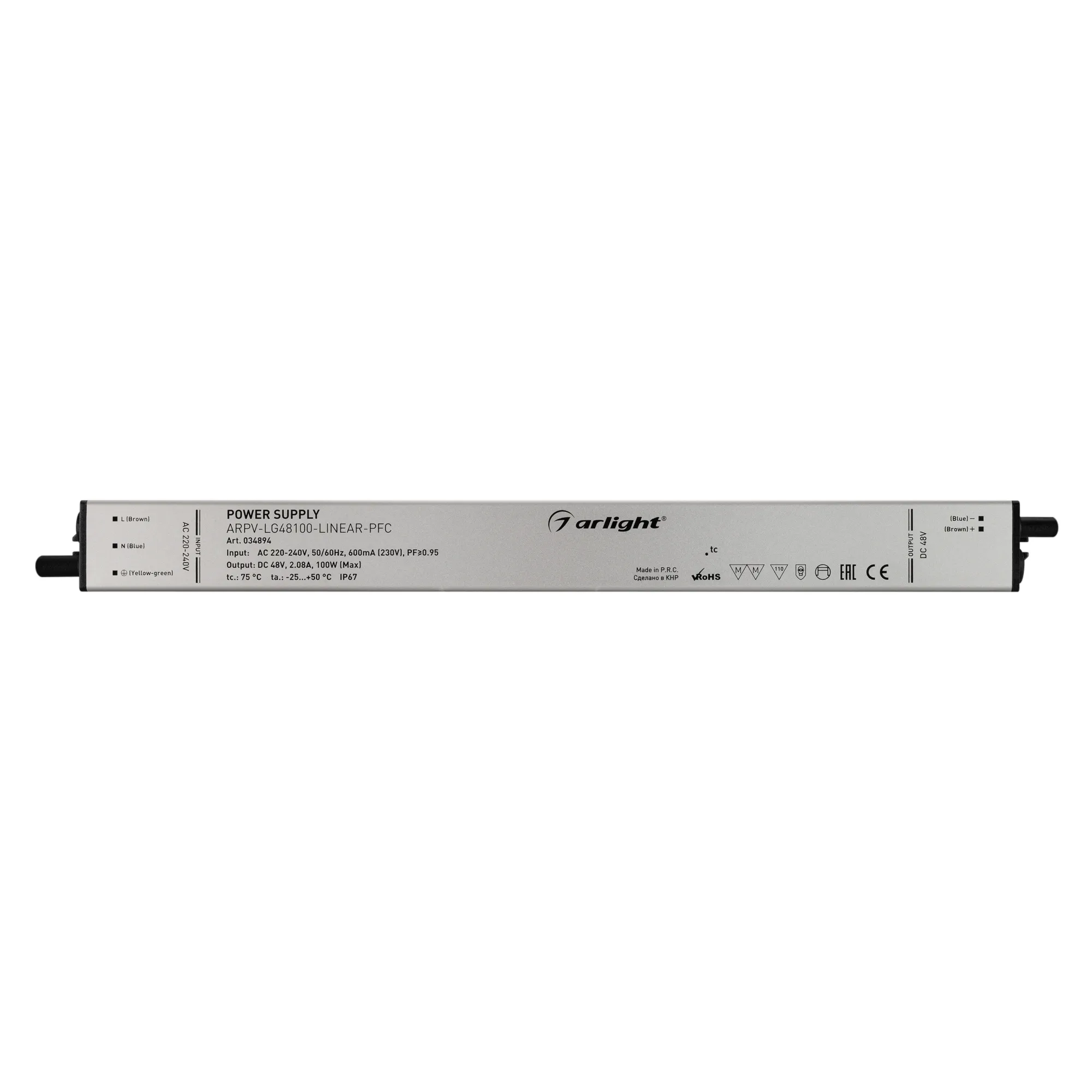 Источник напряжения с гальванической развязкой для светодиодных изделий. Входное напряжение 220-240 VAC. Выходные параметры: 48 В, 2.08 А, 100 Вт. Встроенный PFC >0.95. Тонкий металлический корпус IP67. Вход: 220-240VAC. Выход: 48VDC. Размер 320х30х21 mm.. Совместимость со стандартом EMC. Гарантия 5 лет. Допускается использование только внутри помещений.