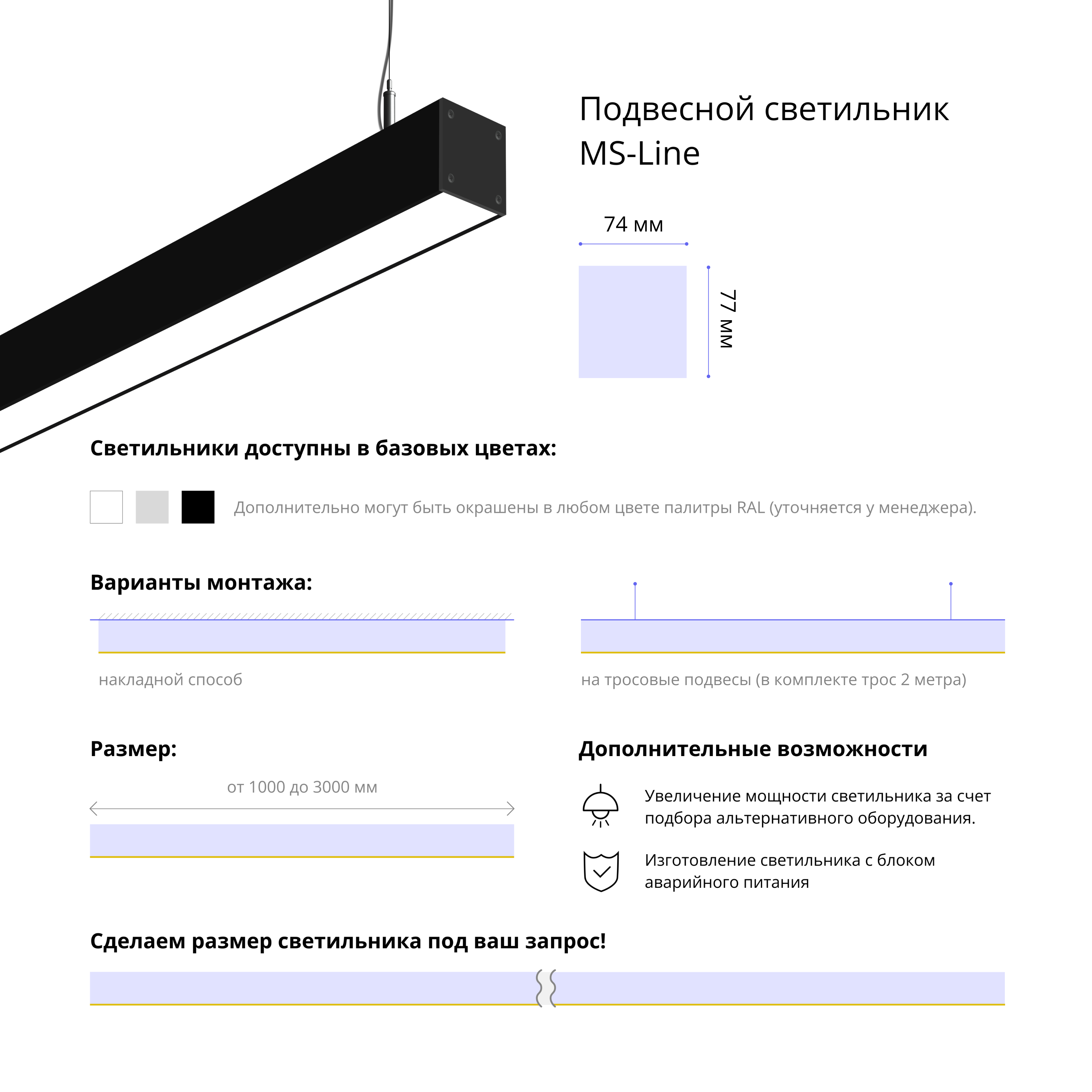 Подвесной светильник MS-LINEAR Линейный размер профиля 77х74мм длиной 2500мм мощностью 40W. Светильник собирается в алюминиевом корпусе с матовым рассеивателем, который дает равномерную засветку по всей площади.