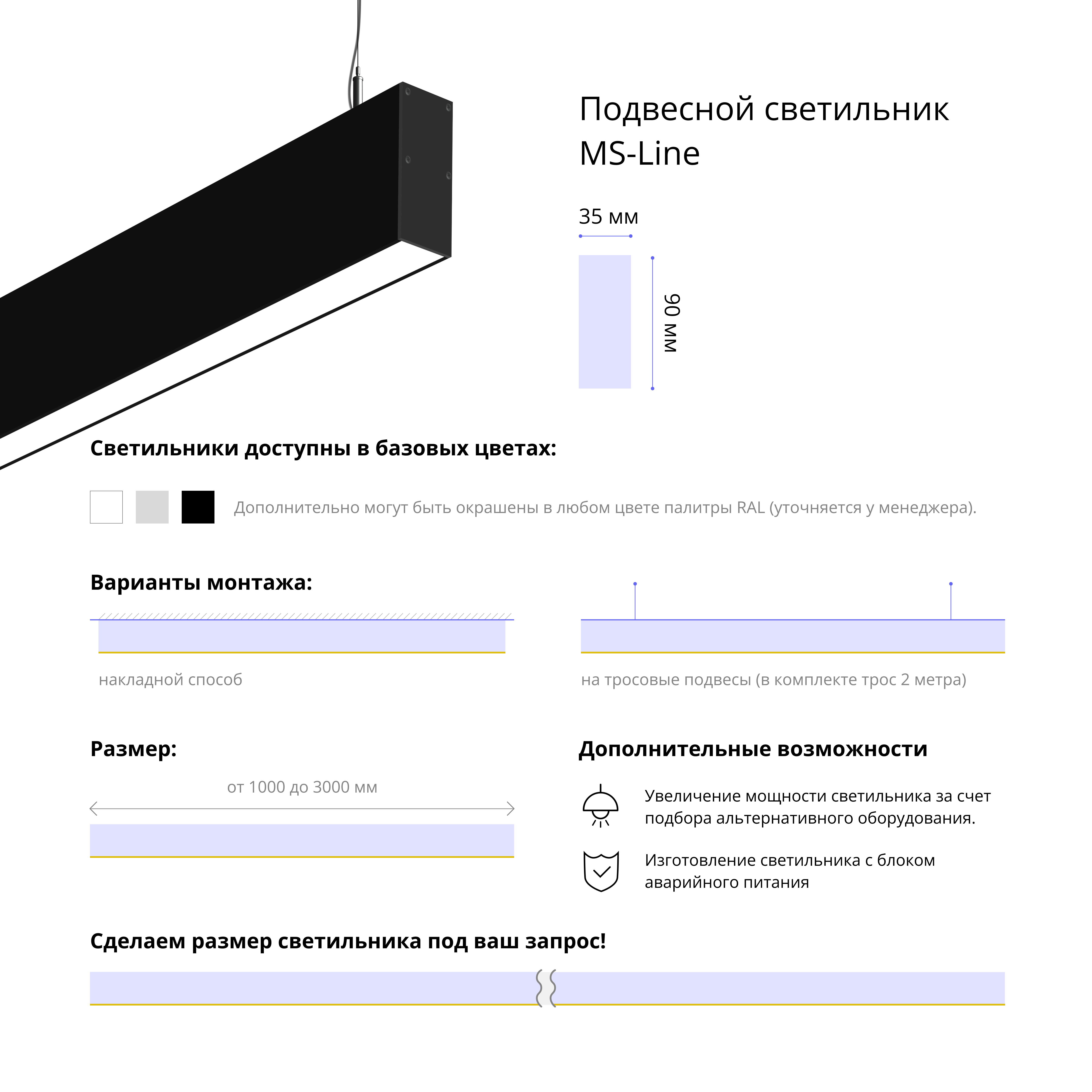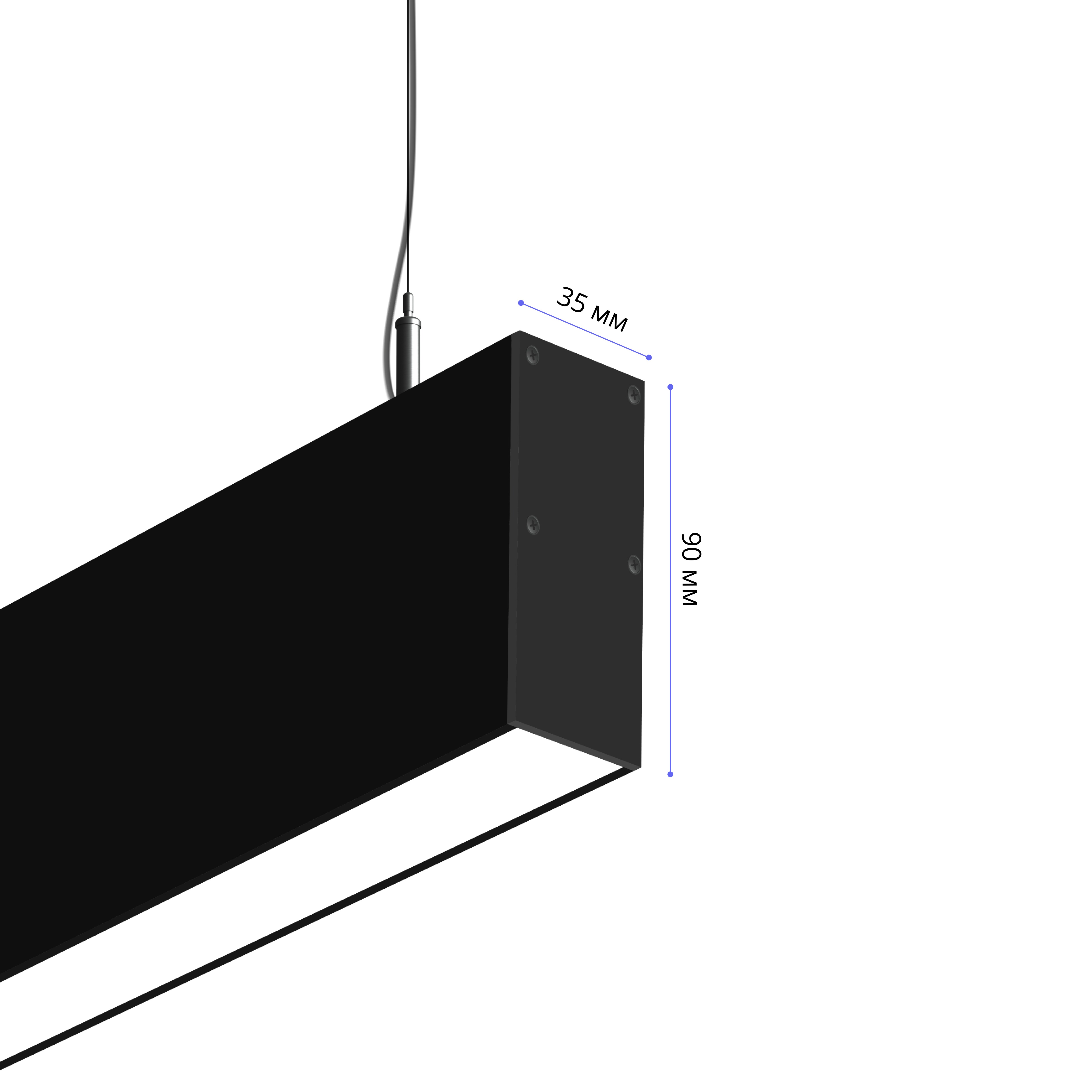Подвесной светильник MS-LINEAR Линейный размер профиля 90х35мм длиной 1000мм мощностью 30W. Светильник собирается в алюминиевом корпусе с матовым рассеивателем, который дает равномерную засветку по всей площади.
