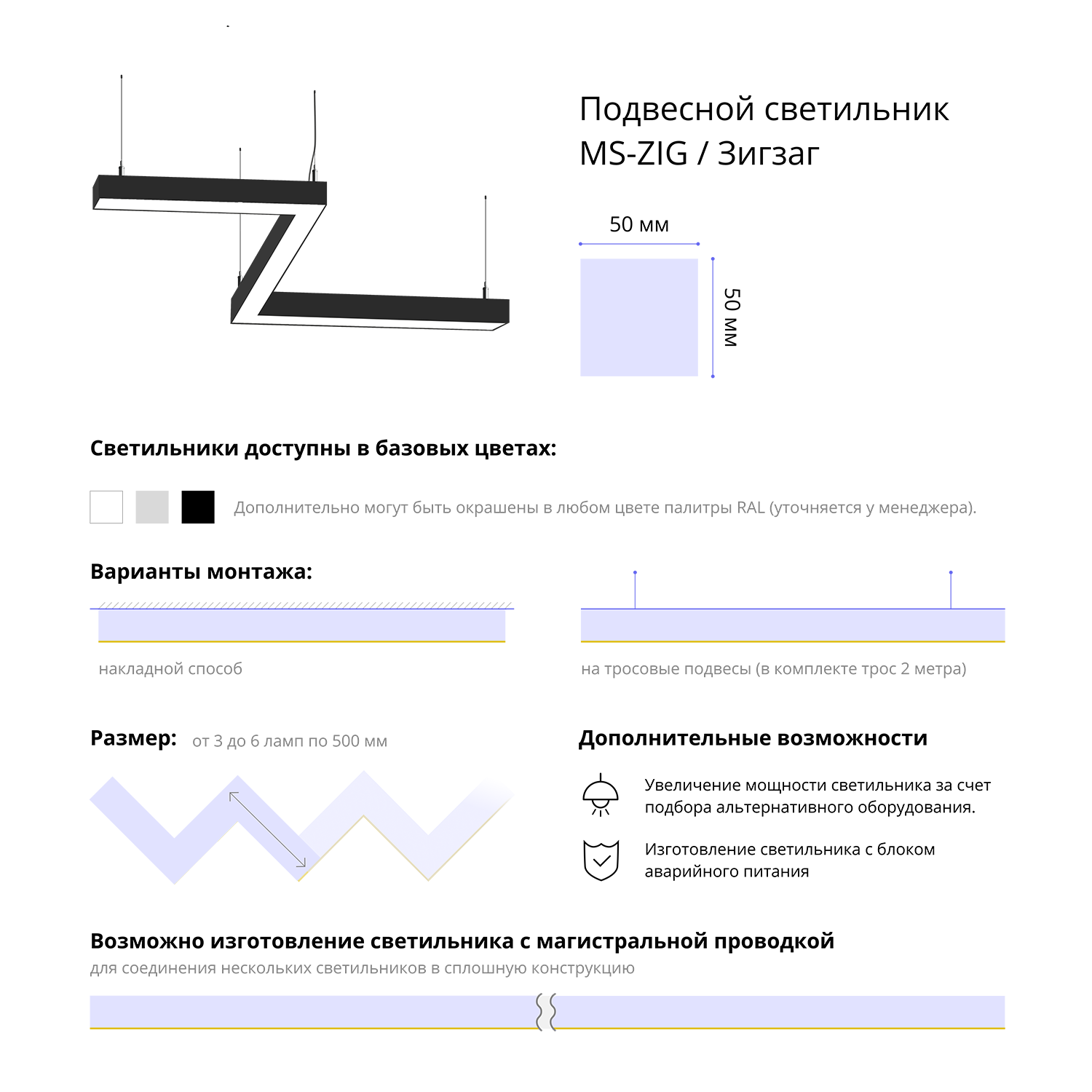 Cветодиодный фигурный светильник MS-ZIG Зигзаг размер профиля 50x50мм длиной 5х500мм мощностью 45W. Светильник собирается из алюминиевого основния с матовым рассеивателем, который дает равномерную засветку по всей площади.