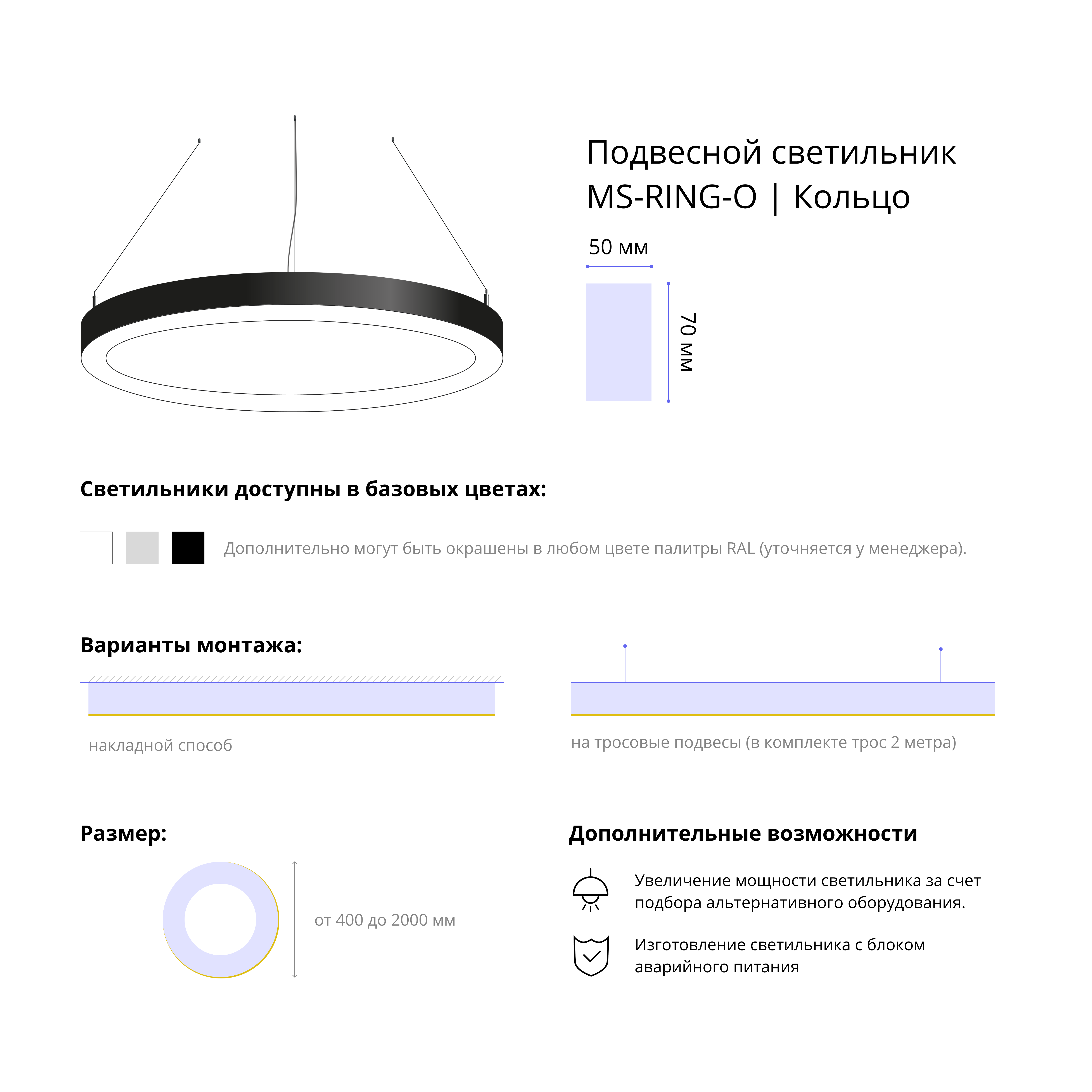 Светодиодный фигурный светильник MS-RING-O Кольцо размер профиля 70х50мм длиной 1700мм мощностью 85W. Светильник собирается в алюминиевом корпусе с матовым рассеивателем, который дает равномерную засветку по всей площади.