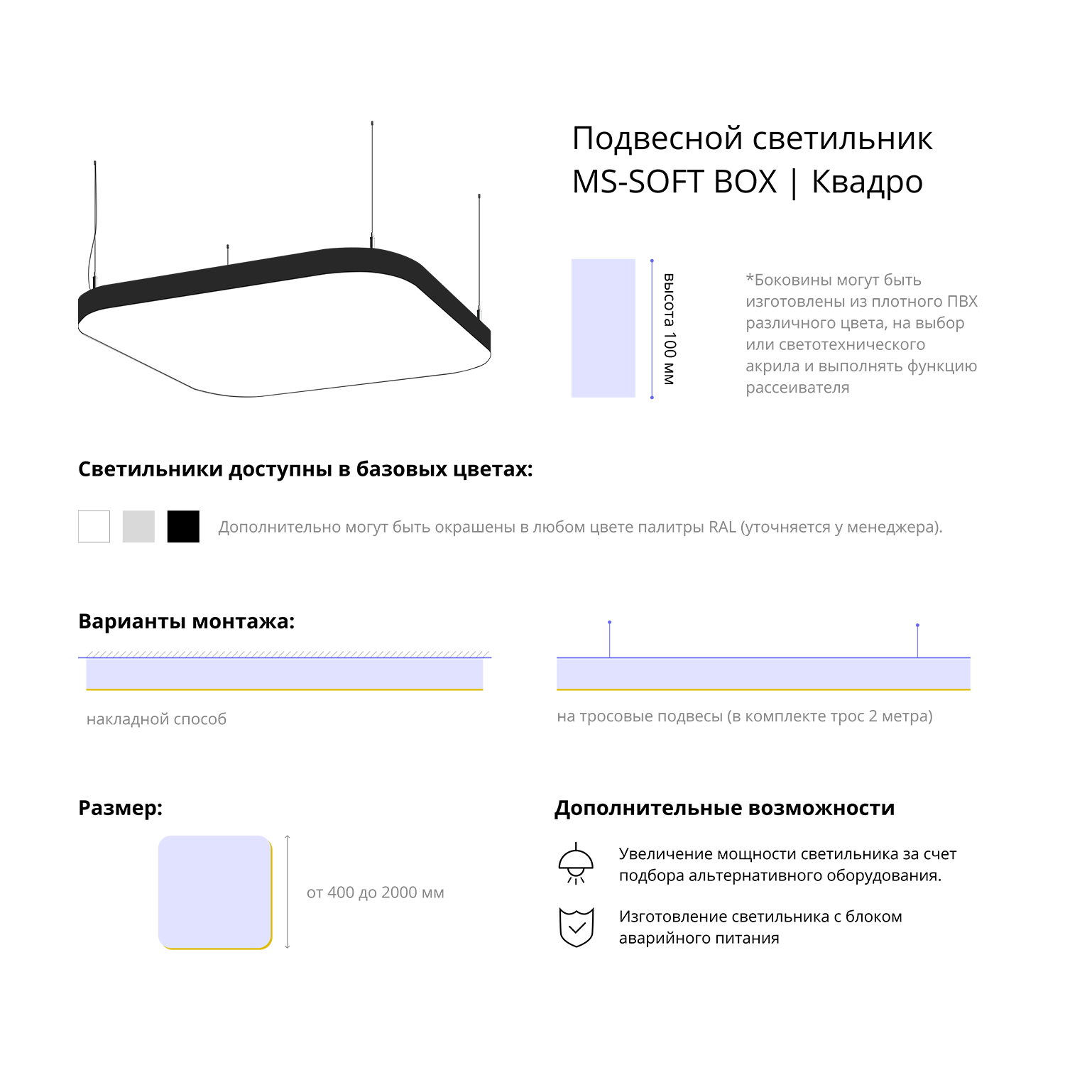 Светодиодный светильник в виде квадрата с мягкими углами MS-Line мощностью 380W и размером 1900мм изготовлен из алюминиевого основания, с установленными на него светодиодными модулями.