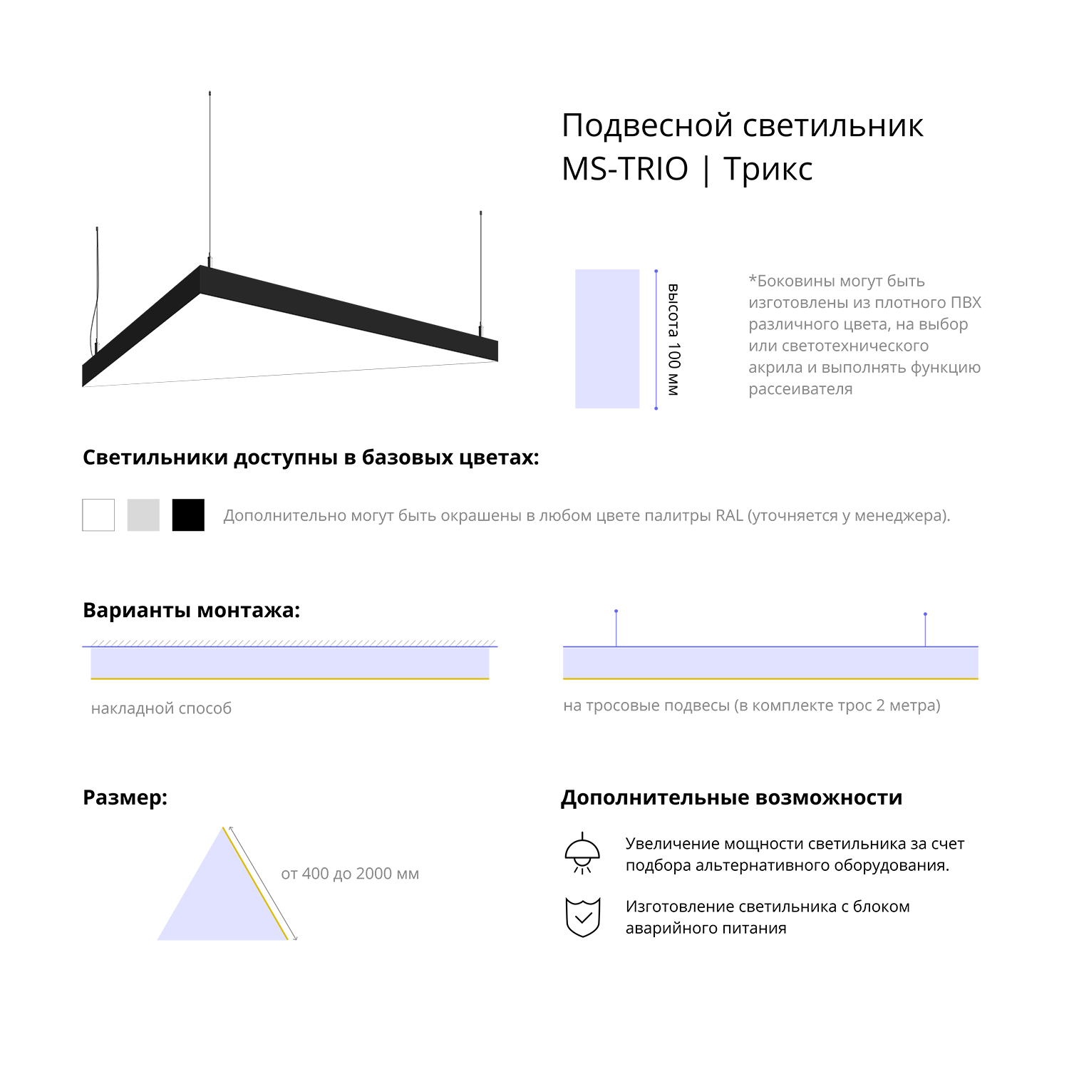 Cветодиодный фигурный светильник MS-TRIO Трикс длиной 500мм мощностью 25W. Светильник собирается из алюминиевого основния с матовым рассеивателем, который дает равномерную засветку по всей площади.