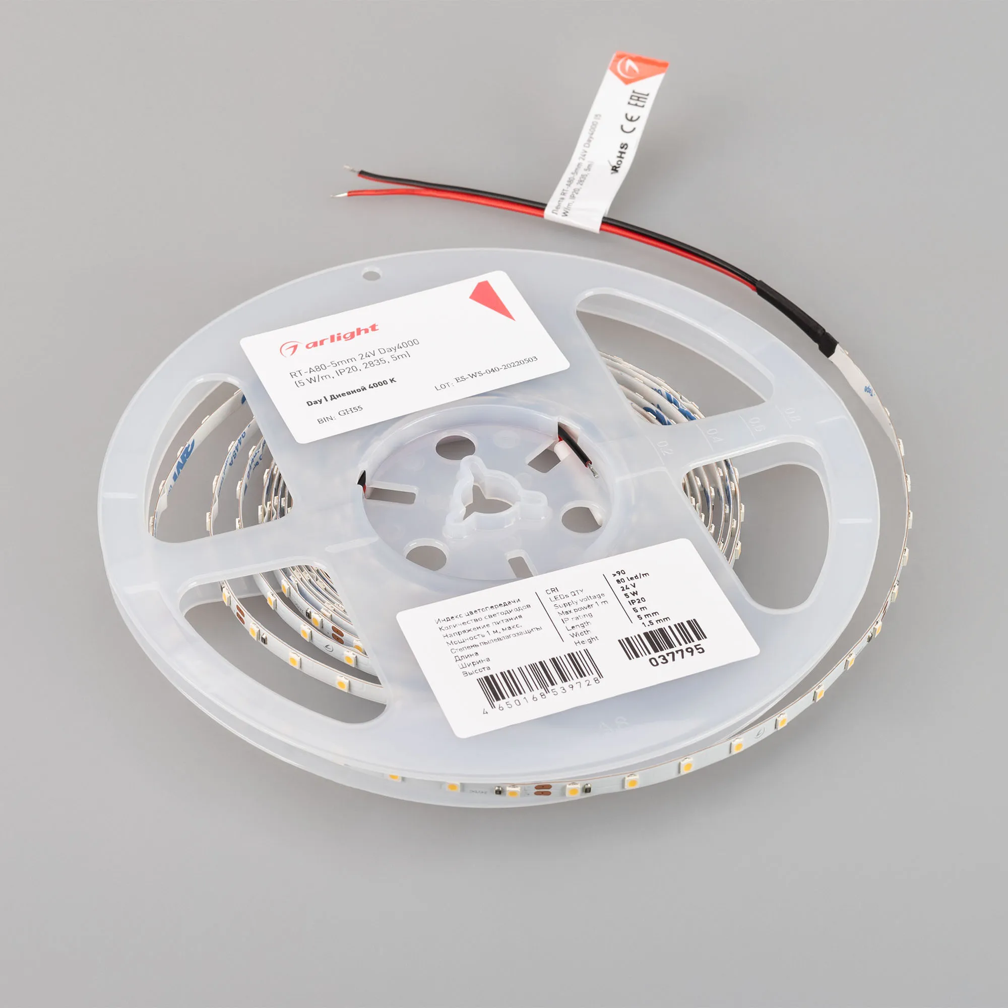 Лента светодиодная RT-A80-5mm 24V Day4000 (5 W/m, IP20, 2835, 5m) (Arlight, Открытый)