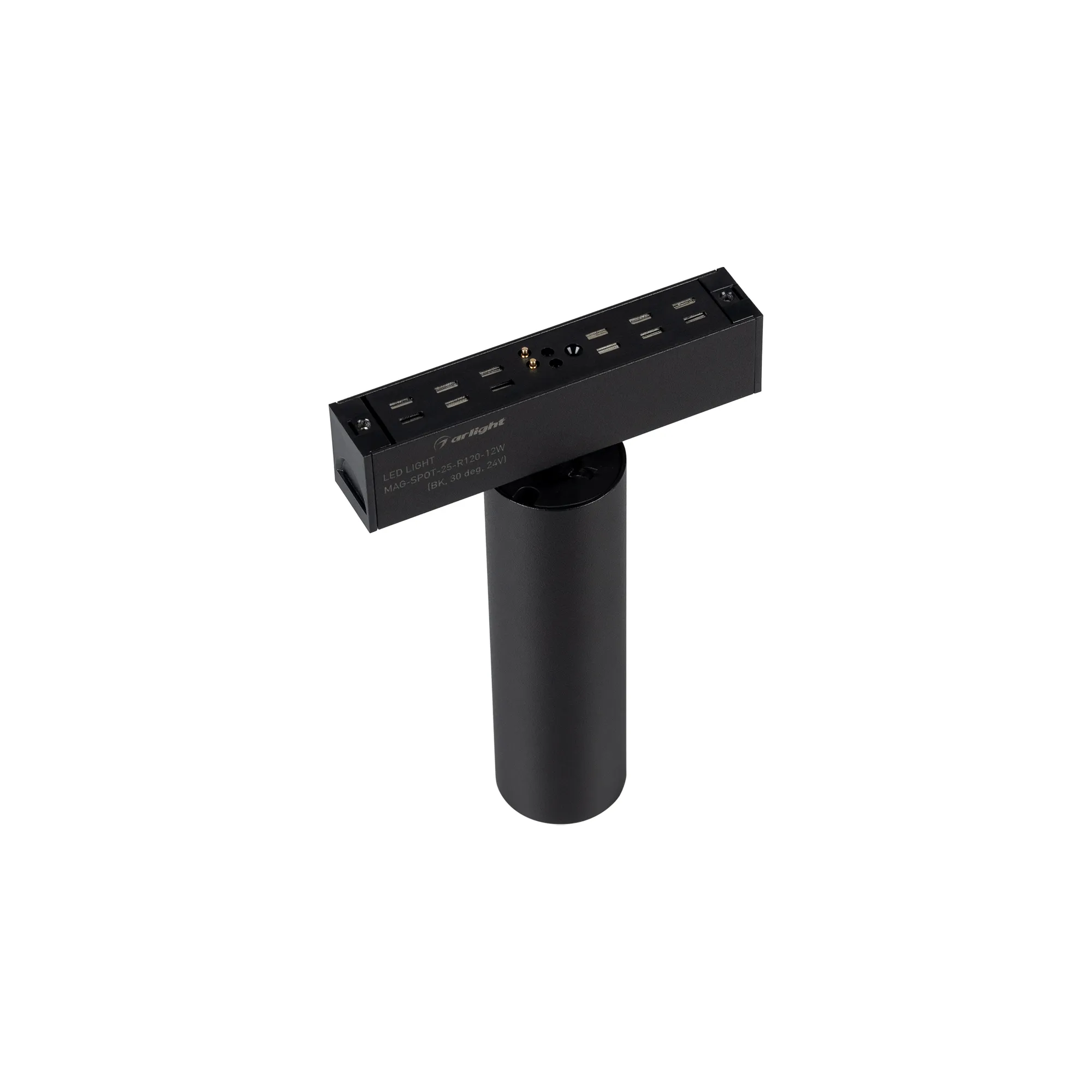 Светильник поворотный для магнитных треков шириной 25 мм, 12 Вт. Цвет свечения ТЕПЛЫЙ 3000K, световой поток 840лм, угол 30°, CRI>90. Корпус прямоугольный, металл, цвет черный, IP20. Размеры LxWxH 100x20x150 мм. Входное напряжение DC24V, мощность 12 Вт. Драйвер AC230V/DC24V поставляется отдельно. Диаметр светоизлучающего модуля 35 мм.
