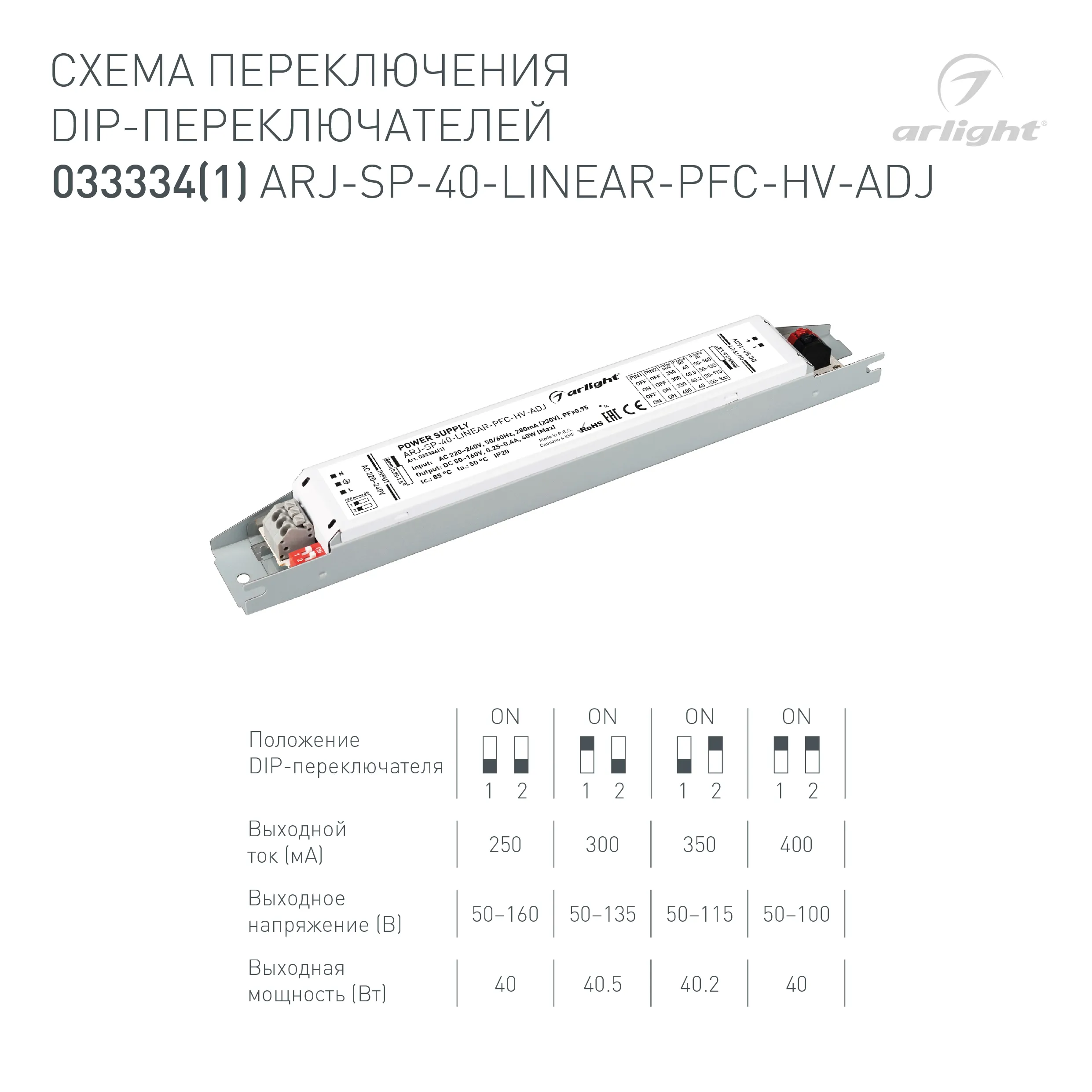 Наши специалисты знают все о продукции Arlight и с радостью помогут Вам выбрать комплектующие к товару "Блок питания ARJ-SP-40-LINEAR-PFC-HV-ADJ (40W, 50-160V, 0.25-0.4A) (Arlight, IP20 Металл, 5 лет)", или другие товары из раздела "регулировка DIP-переключателем".