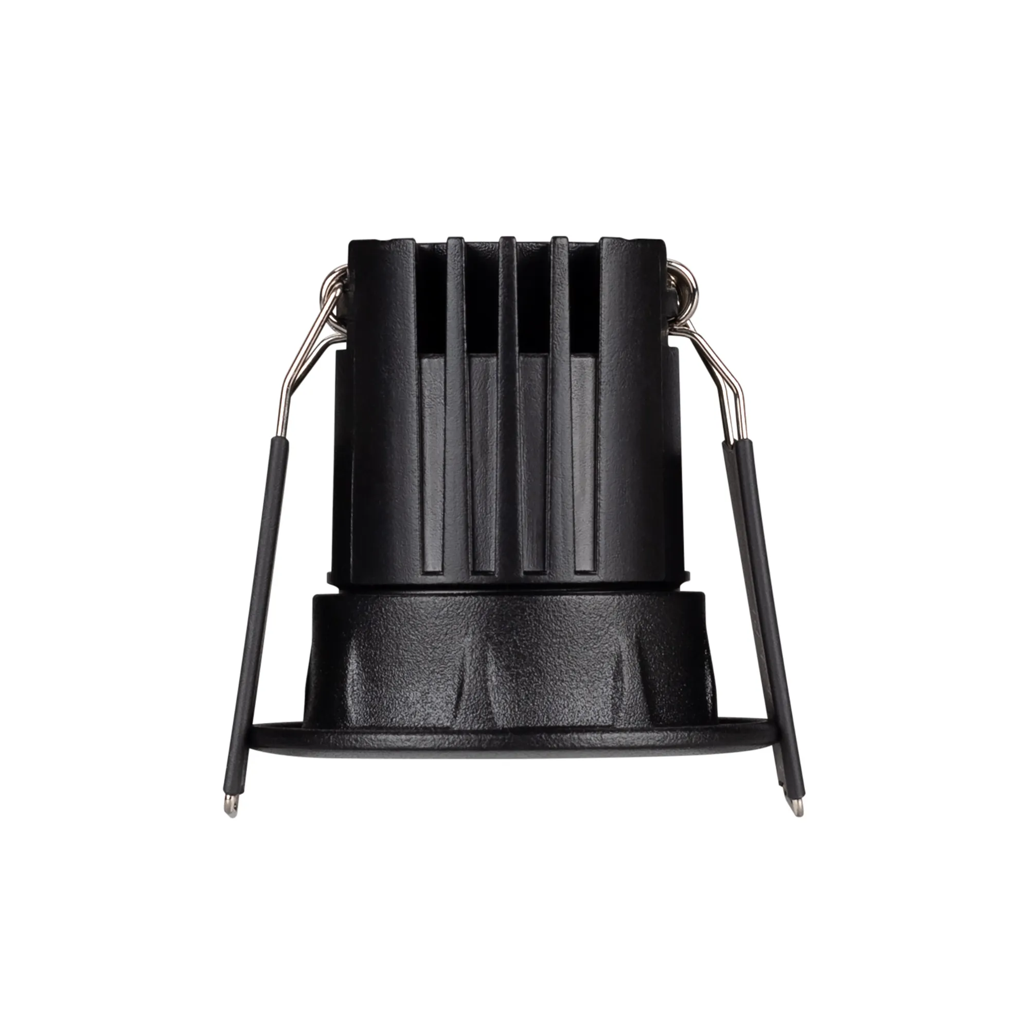 Встраиваемый светильник даунлайт. Мощность 5 Вт, св. поток 400 лм, 80 лм/Вт, тёплый 3000 K, CRI>90, угол 36°, напряжение питания 230 В. Черный круглый корпус из алюминия, экран PMMA, степень защиты IP54. Размер: диаметр 45 мм, высота 43 мм. Монтаж встраиваемый, установочное отверстие: диаметр 35 мм. Драйвер IP54, 8-12 В, 400 мА, пульсация <1%.