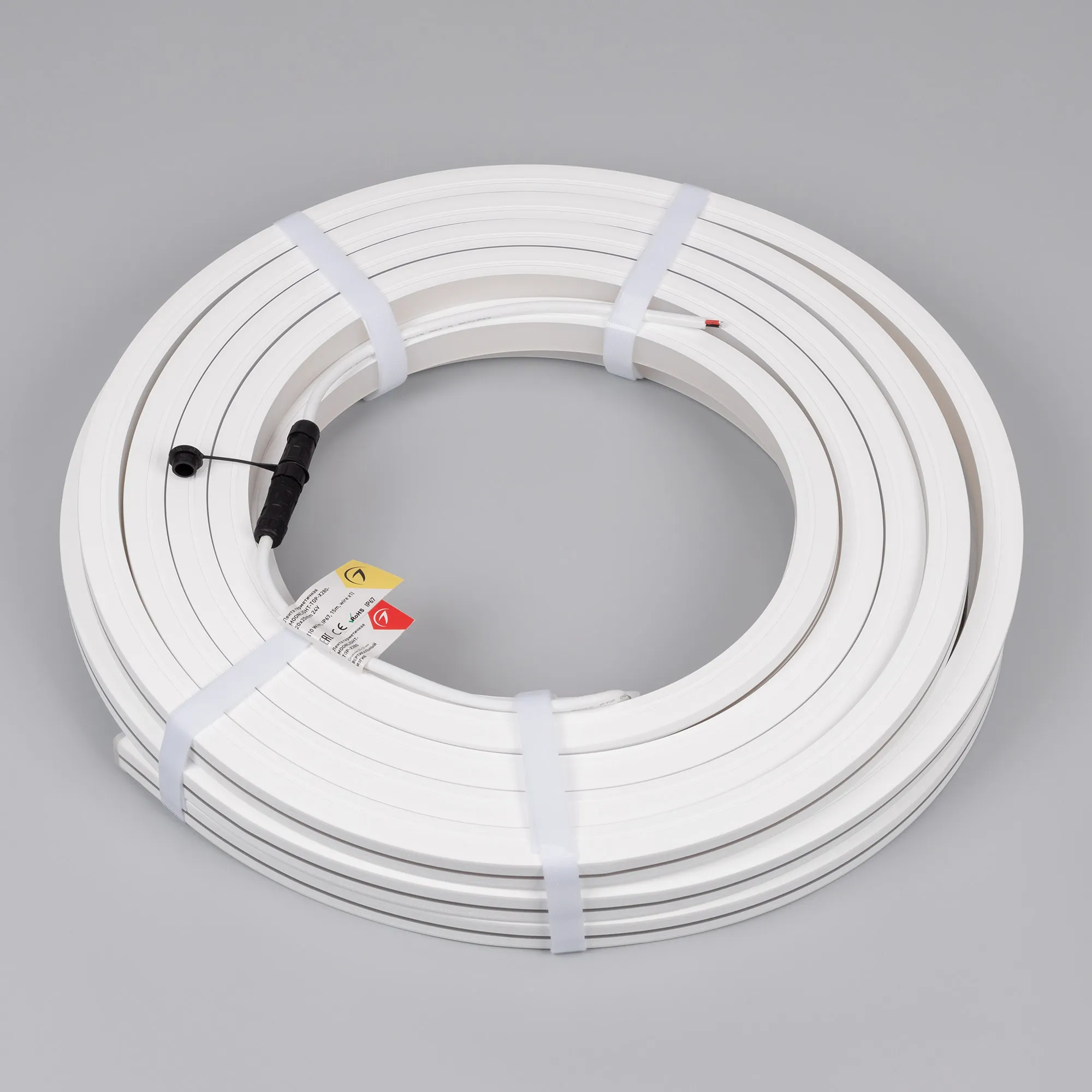 Гибкая герметичная лента (неон серии MOONLIGHT), сечение 20×20 мм. Светодиоды CSP 280 шт/м. Цвет свечения ТЕПЛЫЙ (3500К), индекс цветопередачи CRI>90, световой поток 435 лм/м, угол излучения 114°. Мощность 10 Вт/м, питание 24 В. Класс пылевлагозащиты IP67. Размеры 15000×20×20 мм. Мин. отрезок 50 мм. Вертикальный изгиб TOP, минимальный радиус изгиба 180 мм. Катушка 15 м. Цена за 1 м. Гарантия 5 лет.