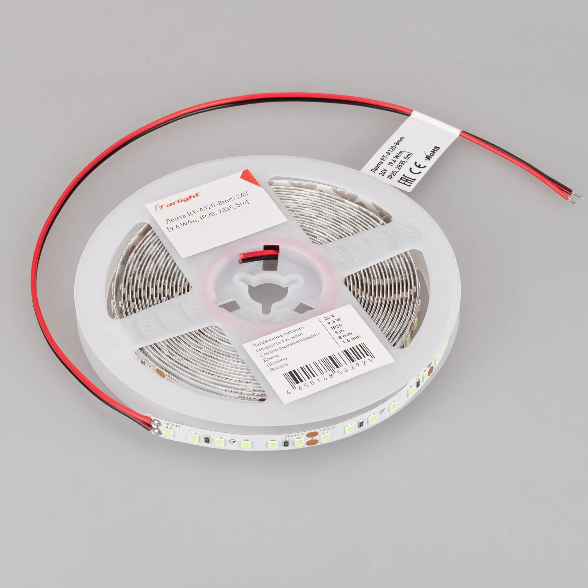 В магазине Мельковский Свет Вы можете купить "Лента светодиодная RT-A120-8mm 24V Tiffany (9.6 W/m, IP20, 2835, 5m) (Arlight, -)"