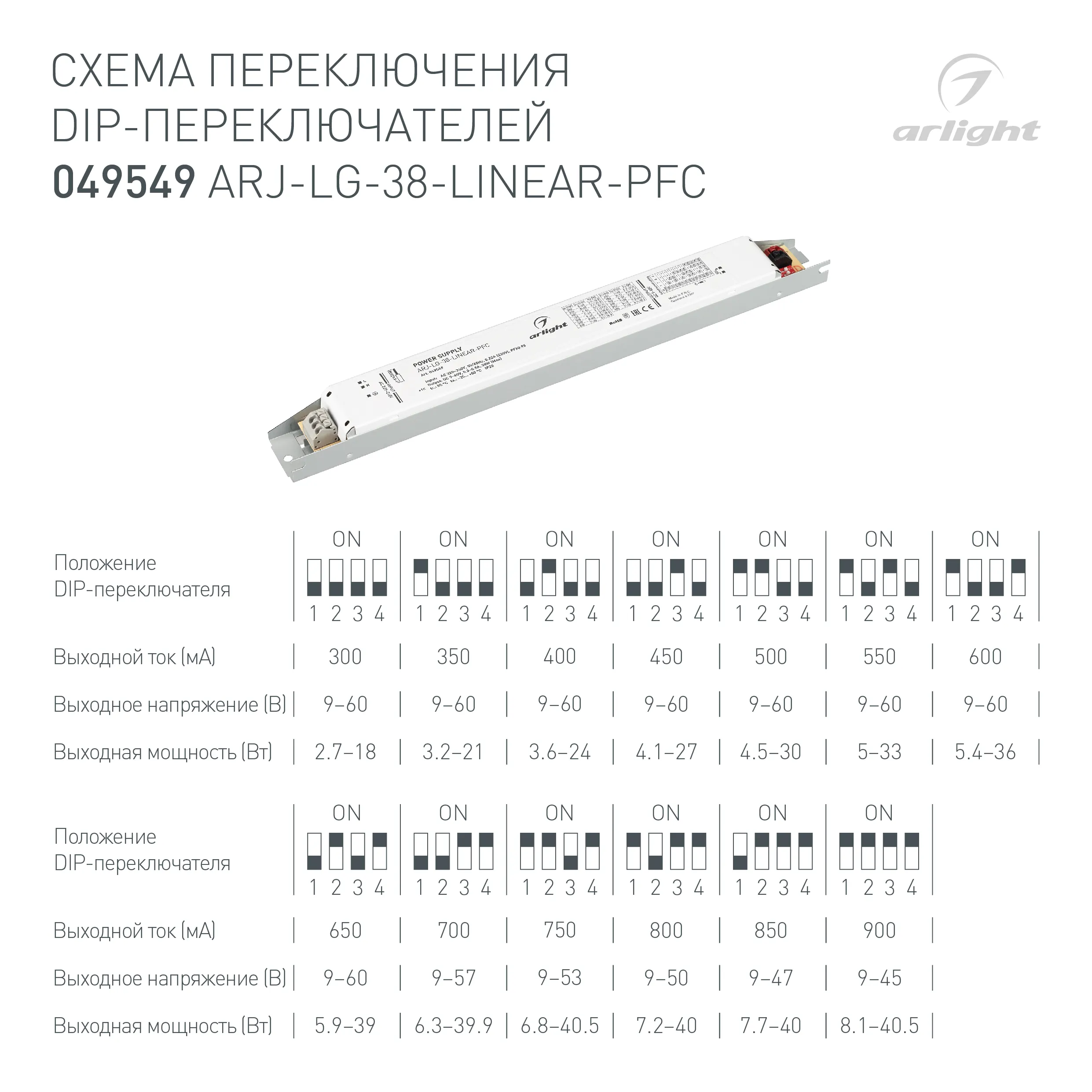 Наши специалисты знают все о продукции Arlight и с радостью помогут Вам выбрать комплектующие к товару "Блок питания ARJ-LG-38-LINEAR-PFC (38W, 9-60V, 0.3-0.9A) (Arlight, IP20 Металл, 5 лет)", или другие товары из раздела "регулировка DIP-переключателем".