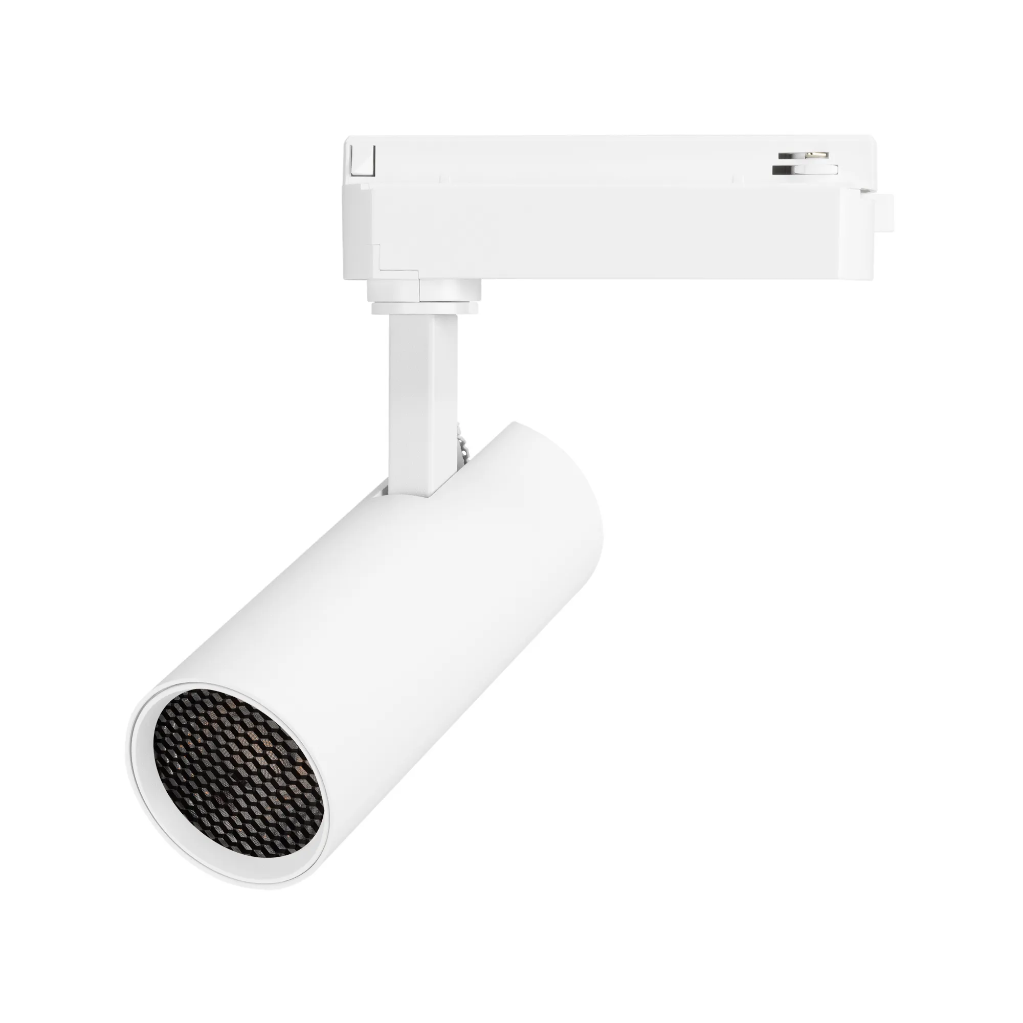 Светильник для треков/шин 2 провода. Мощность 10 Вт, св. поток без решетки honeycomb 1000 лм, 100 лм/Вт, с решеткой honeycomb 660 лм, 66 лм/Вт, теплый 3000 K, CRI>90, угол 24°, напряжение питания 230 В. Белый круглый корпус из алюминия, материал линзы PMMA, степень защиты IP20. Размер: диаметр 55 мм, длина световой части 141 мм. Монтаж на трек 1-фазный. Драйвер встроенный 25-40 В, 250мА., пульсация <5%.