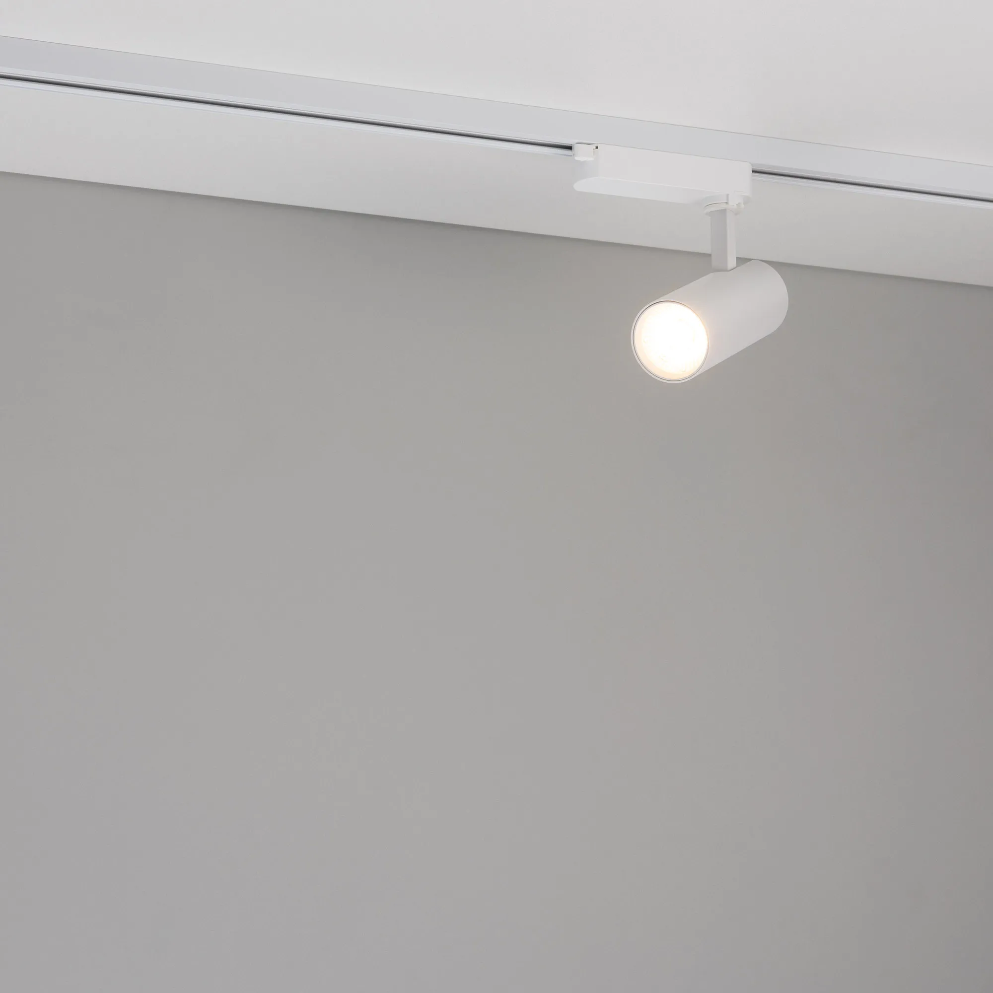 Светильник для треков/шин 2 провода. Мощность 15 Вт, св. поток без решетки honeycomb 1500 лм, 100 лм/Вт, с решеткой honeycomb 990 лм, 66 лм/Вт, тёплый 3000 K, CRI>90, угол 15°, напряжение питания 230 В. Белый круглый корпус из алюминия, материал линзы PMMA, степень защиты IP20. Размер: диаметр 60 мм, длина световой части 141 мм. Монтаж на трек 1-фазный. Драйвер встроенный 350 мА 25-40 В, пульсация <5%.