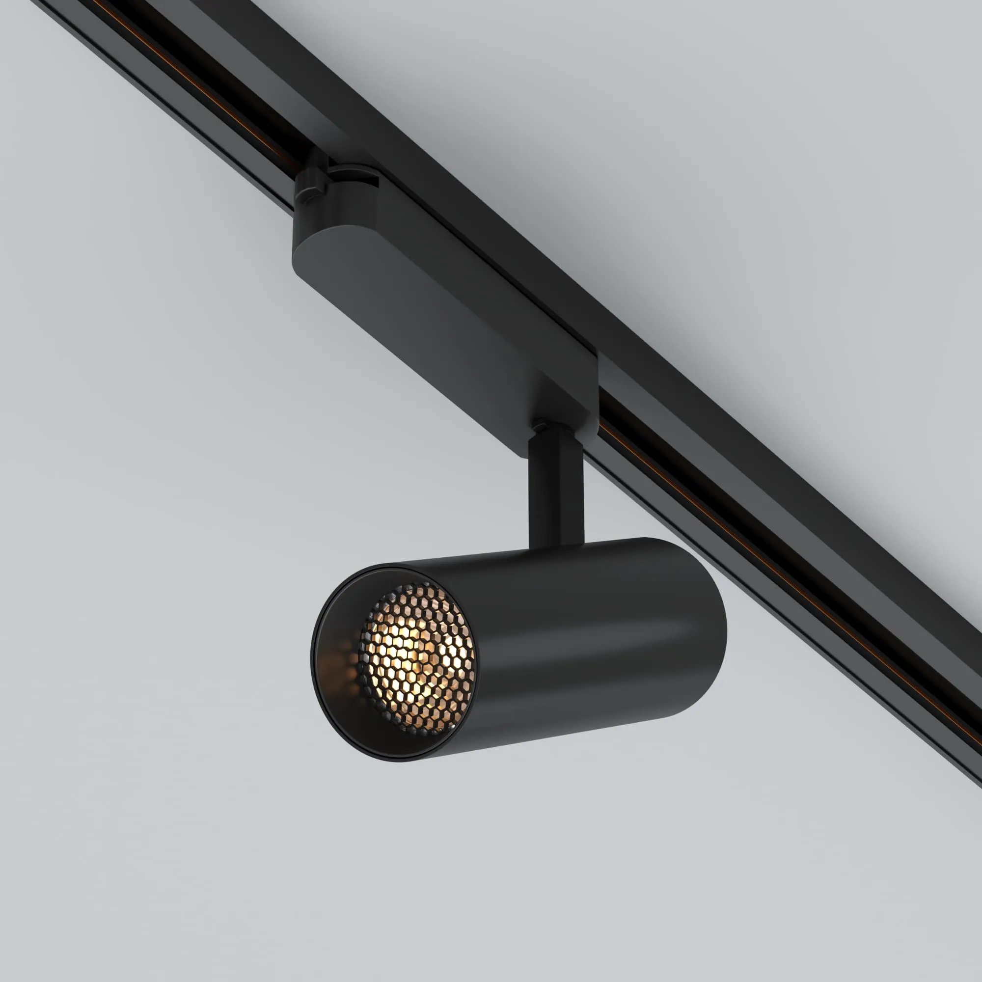 Светильник для треков/шин 2 провода. Мощность 10 Вт, св. поток без решетки honeycomb 1000 лм, 100 лм/Вт, с решеткой honeycomb 660 лм, 66 лм/Вт, теплый 3000 K, CRI>90, угол 55°, напряжение питания 230 В. Черный круглый корпус из алюминия, материал линзы PMMA, степень защиты IP20. Размер: диаметр 55 мм, длина световой части 141 мм. Монтаж на трек 1-фазный. Драйвер встроенный 25-40 В, 250мА., пульсация <5%.