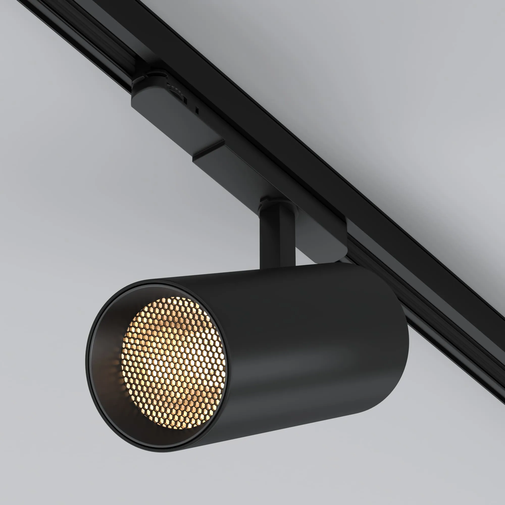 Светильник для треков/шин 4 провода. Мощность 30 Вт, св. поток без решетки honeycomb 3000 лм, 100 лм/Вт, с решеткой honeycomb 1980 лм, 66 лм/Вт, дневной 4000 K, CRI>90, угол 24°, напряжение питания 230 В. Черный круглый корпус из алюминия, материал линзы PMMA, степень защиты IP20. Размер: диаметр 90 мм, длина световой части 141 мм. Монтаж на трек 3-фазный. Драйвер встроенный 24-42 В, 750мА., пульсация <5%