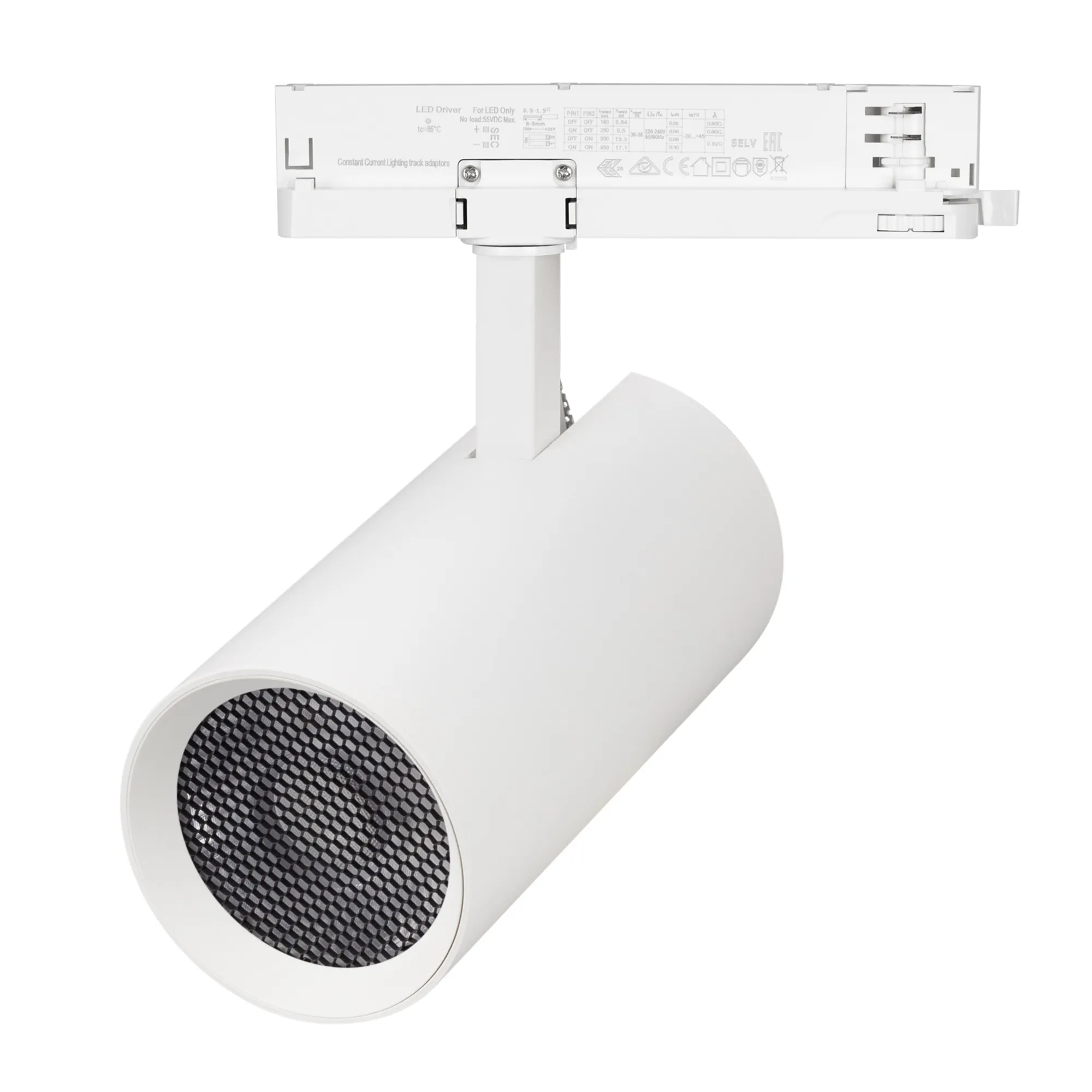 Светильник для треков/шин 4 провода. Мощность 40Вт, св. поток без решетки honeycomb 4000 лм, 100 лм/Вт, с решеткой honeycomb 2640 лм, 66 лм/Вт, дневной 4000 K, CRI>90, угол 24°, напряжение питания 230 В. Белый круглый корпус из алюминия, материал линзы PMMA, степень защиты IP20. Размер: диаметр 90 мм, длина световой части 141 мм. Монтаж на трек 3-фазный. Драйвер встроенный 24-42 В, 750мА., пульсация <5%