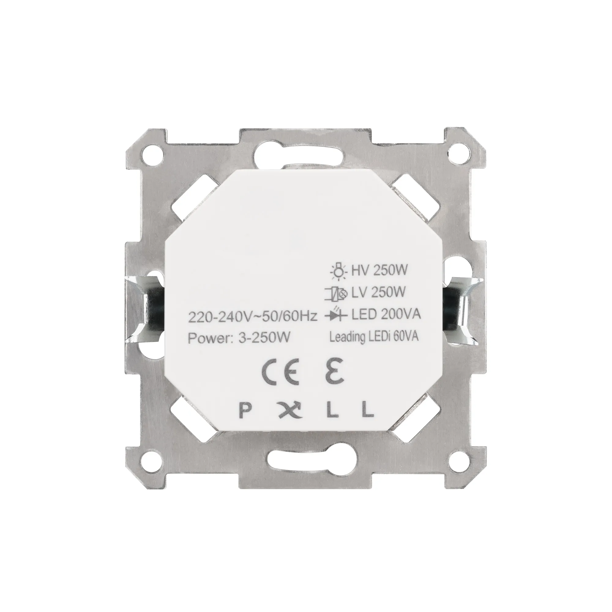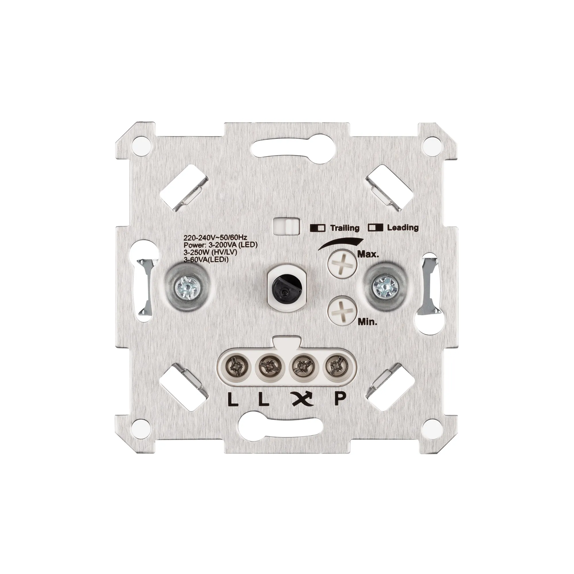 Встраиваемая роторная панель для управления устройствами по протоколу TRIAC. DIP-переключатель выбора режима диммирования по переднему (Leading Edge )/заднему фронту(Trailing Edge). Не требует подключения N провода. Регулировка ограничения минимального и максимального уровня яркости. Питание/рабочее напряжение 220-240VAC. В режиме TE: резистивная нагрузка и лампы накаливания 250Вт, светодиодные лампы 200 ВА. Декоративная накладка не входит в комплект. Клеммы Push-Dim для возвратных нажимных выключателей. Габариты 70.6х70.6х35 мм.