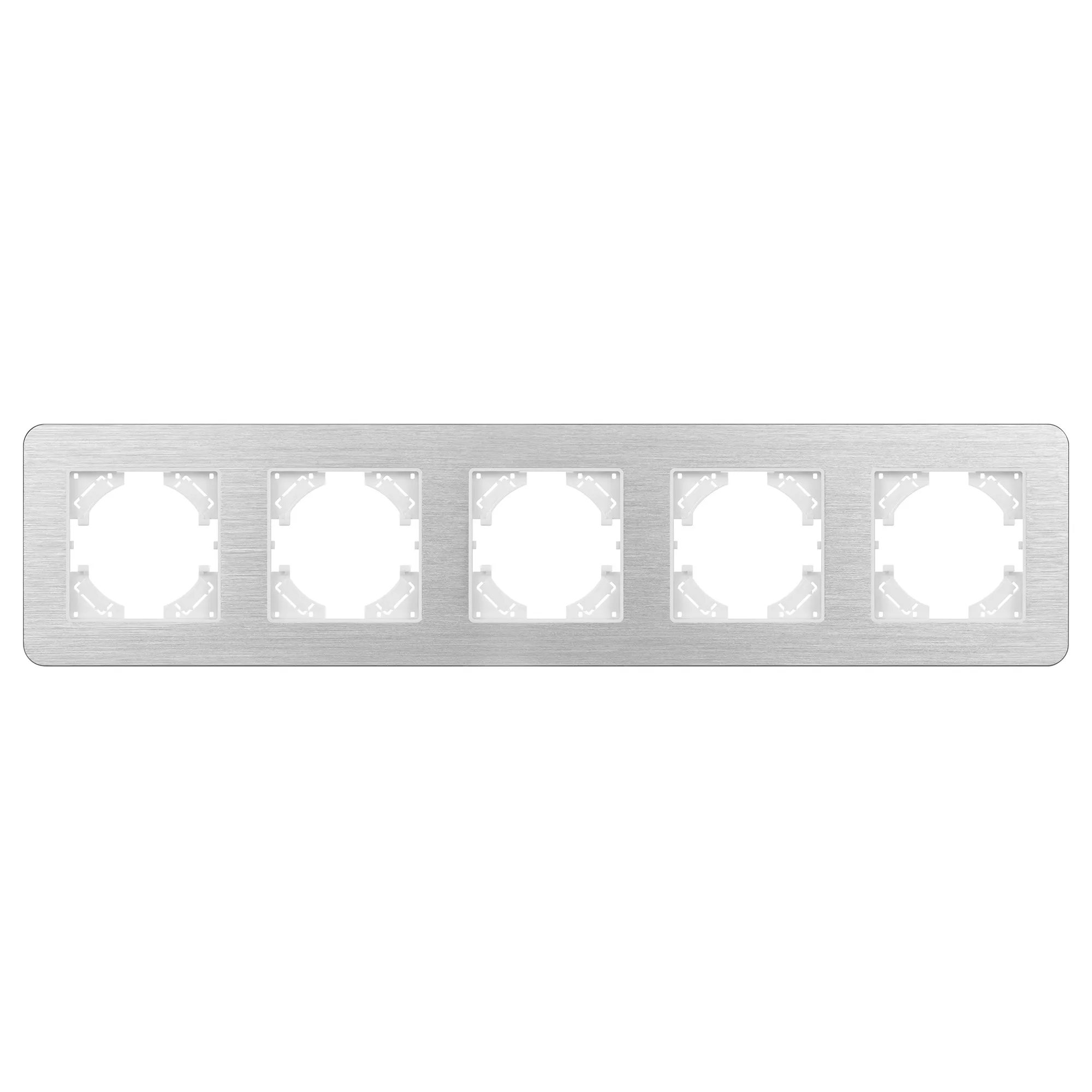 Рамка алюминиевая на 5 постов, под встраиваемый механизм. Цвет - серебристый. Среднего уровня герметичности IP20. Ориентация монтажа - горизонтальная (основным ориентиром служат посадочные выступы для накладки механизма).