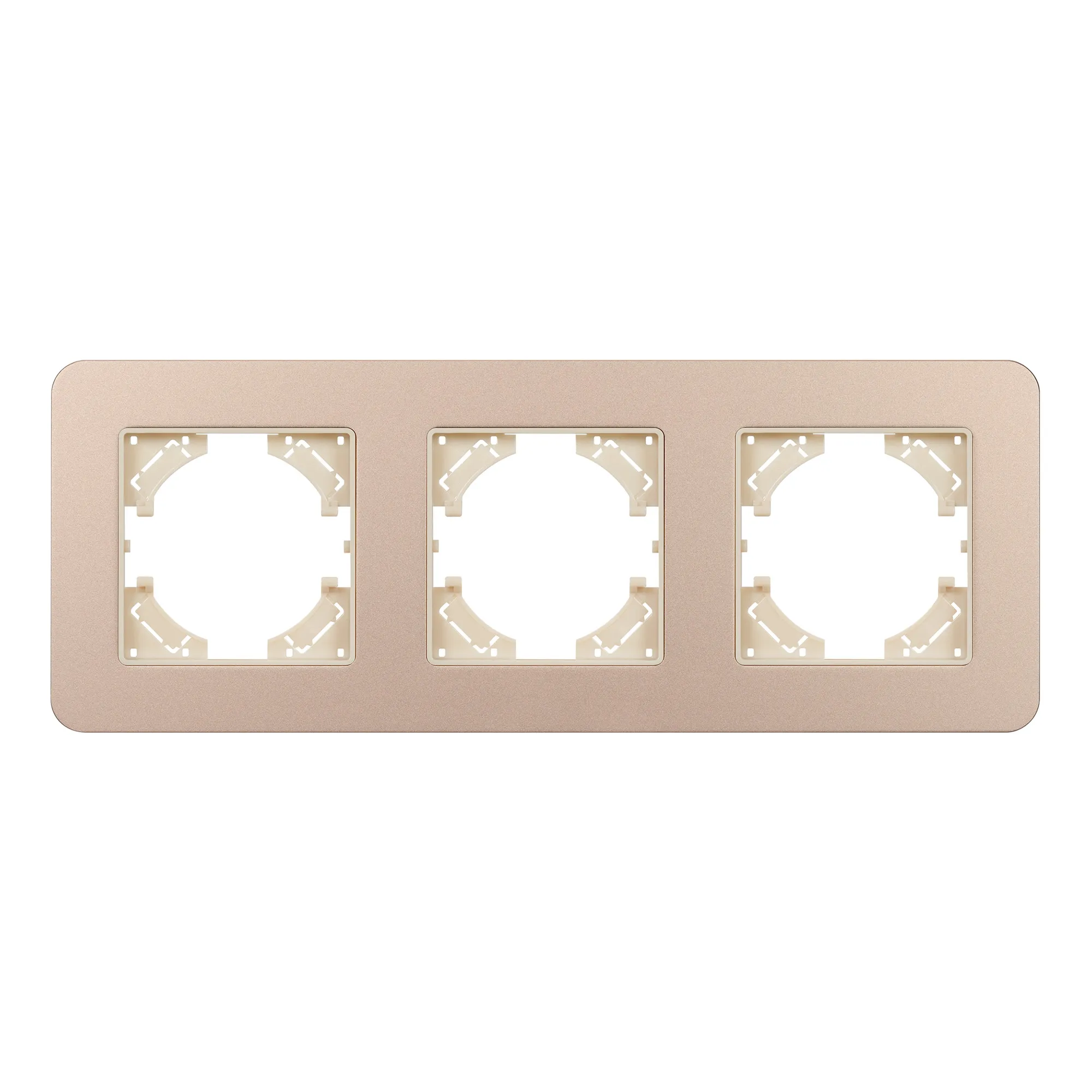Рамка алюминиевая на 3 поста, под встраиваемый механизм. Цвет - золотой с Soft-Touch покрытием. Среднего уровня герметичности IP20. Ориентация монтажа - горизонтальная (основным ориентиром служат посадочные выступы для накладки механизма).