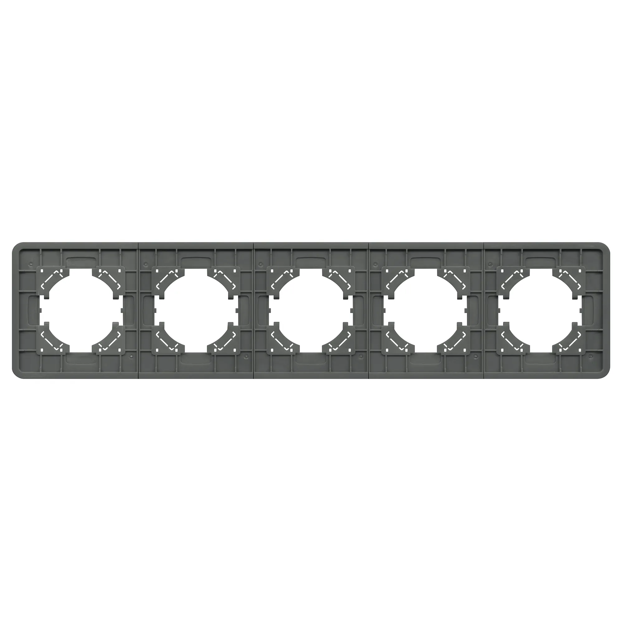 Рамка стеклянная на 5 постов, под встраиваемый механизм. Цвет - серый с Soft-Touch покрытием. Среднего уровня герметичности IP20. Ориентация монтажа - горизонтальная (основным ориентиром служат посадочные выступы для накладки механизма).