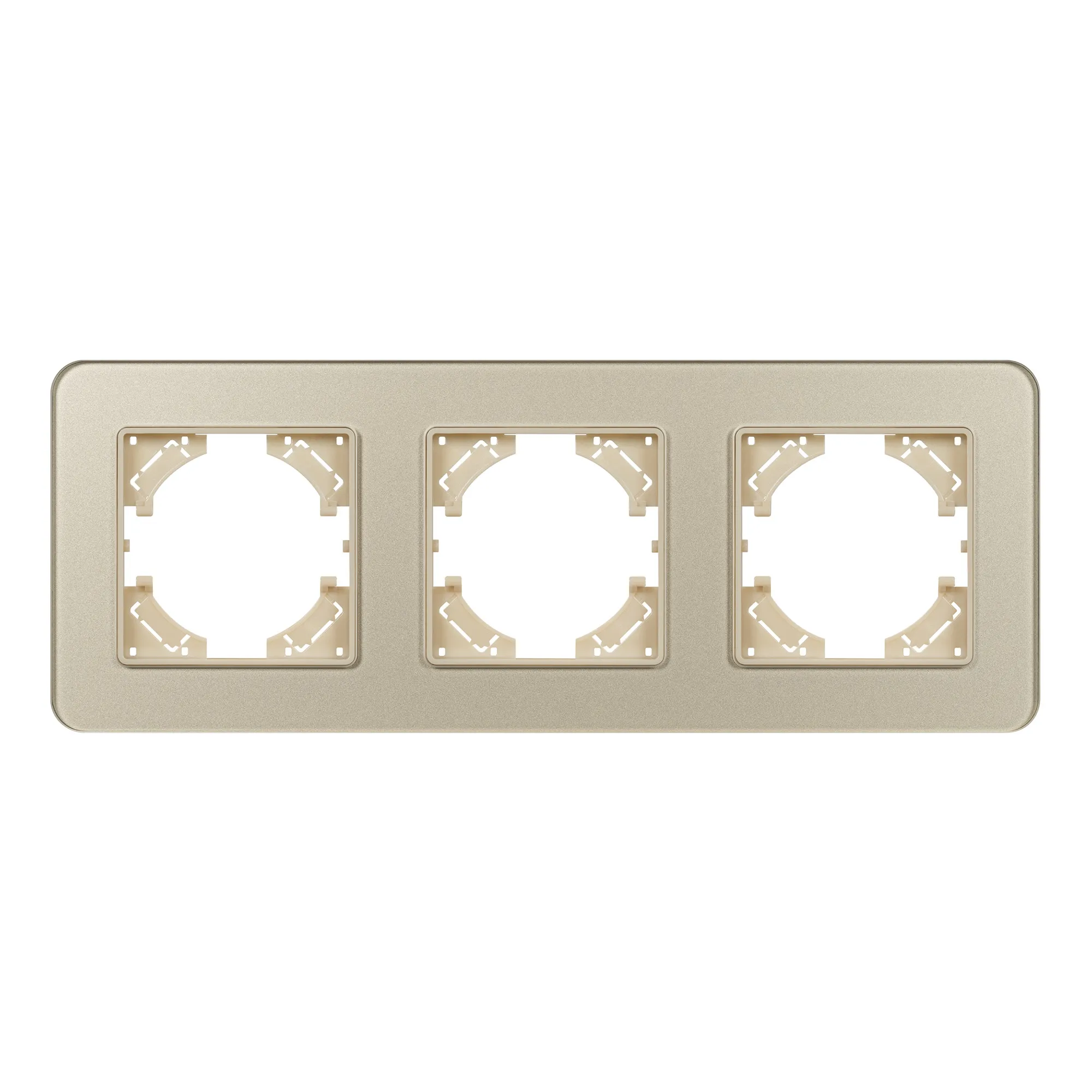 Рамка стеклянная на 3 поста, под встраиваемый механизм. Цвет - золотой. Среднего уровня герметичности IP20. Ориентация монтажа - горизонтальная (основным ориентиром служат посадочные выступы для накладки механизма).