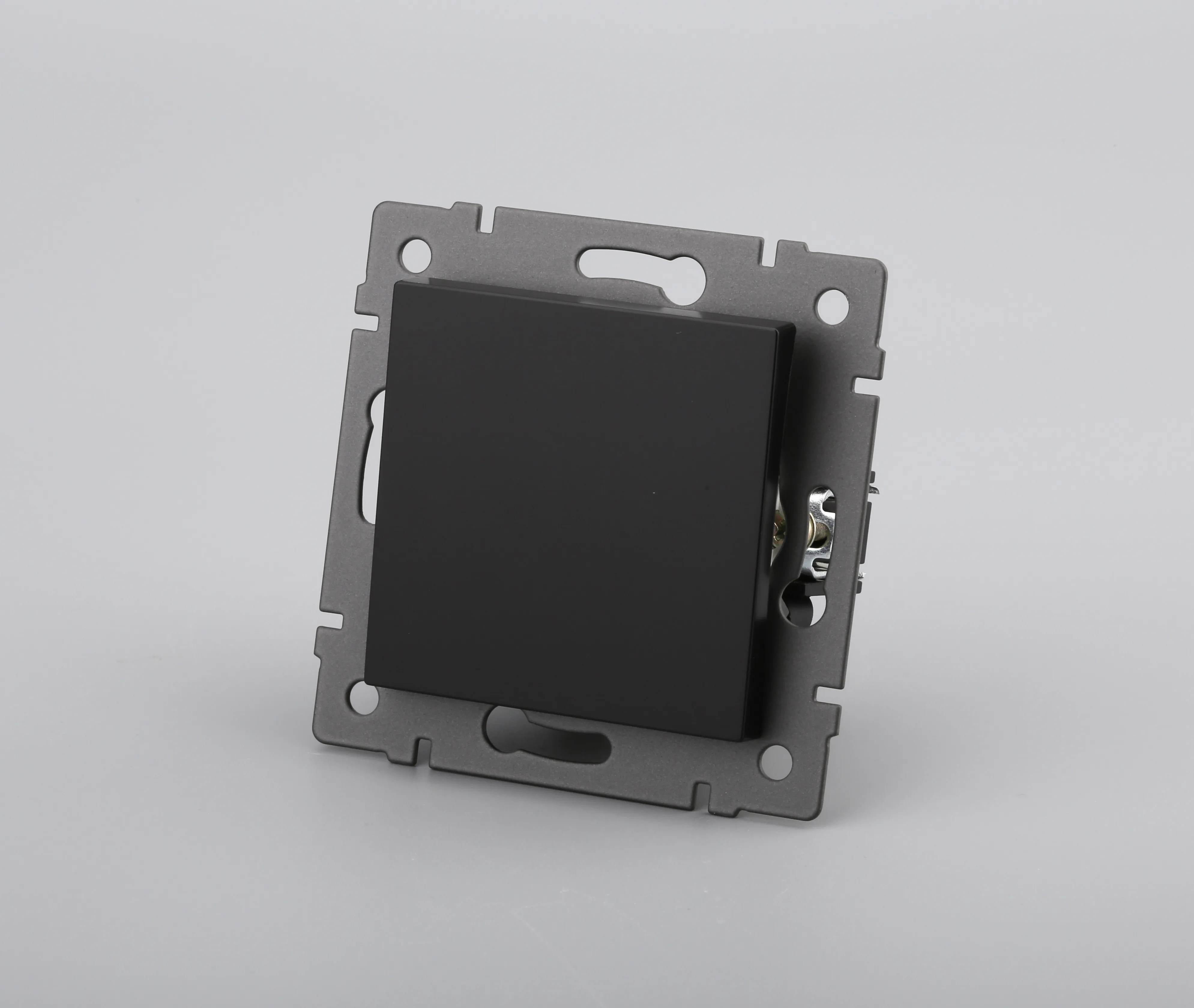 Механизм выключателя света клавишный на 1 пост 1 возвратная клавиша. Цвет - черный. Без фронтальной рамки. Уровень пылевлагозащиты IP20. Выключатель устанавливается в стандартный круглый подрозетник.
