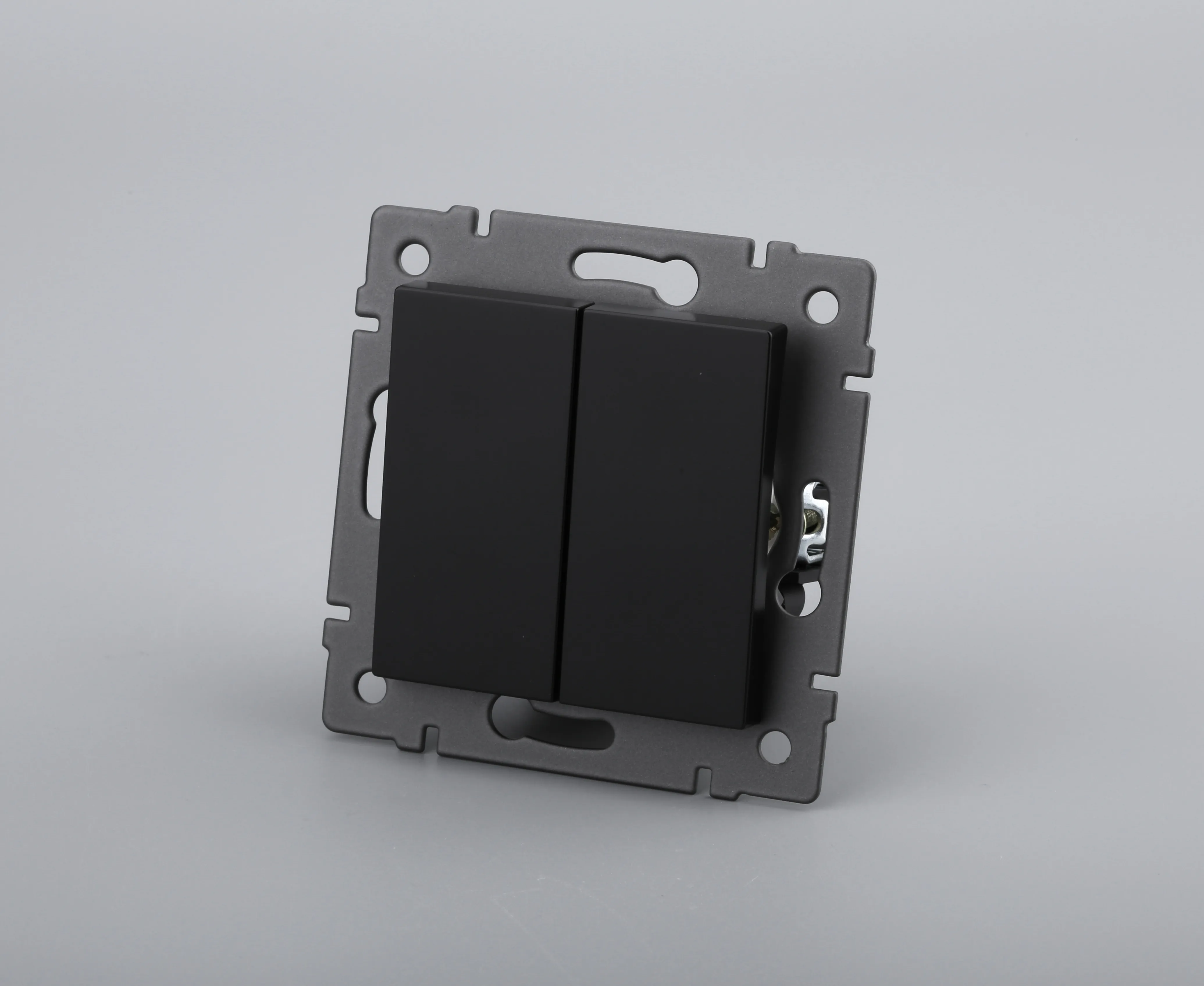 Механизм выключателя света клавишный на 1 пост 2 клавиши (проходной). Цвет - черный. Без фронтальной рамки. Уровень пылевлагозащиты IP20. Выключатель устанавливается в стандартный круглый подрозетник.