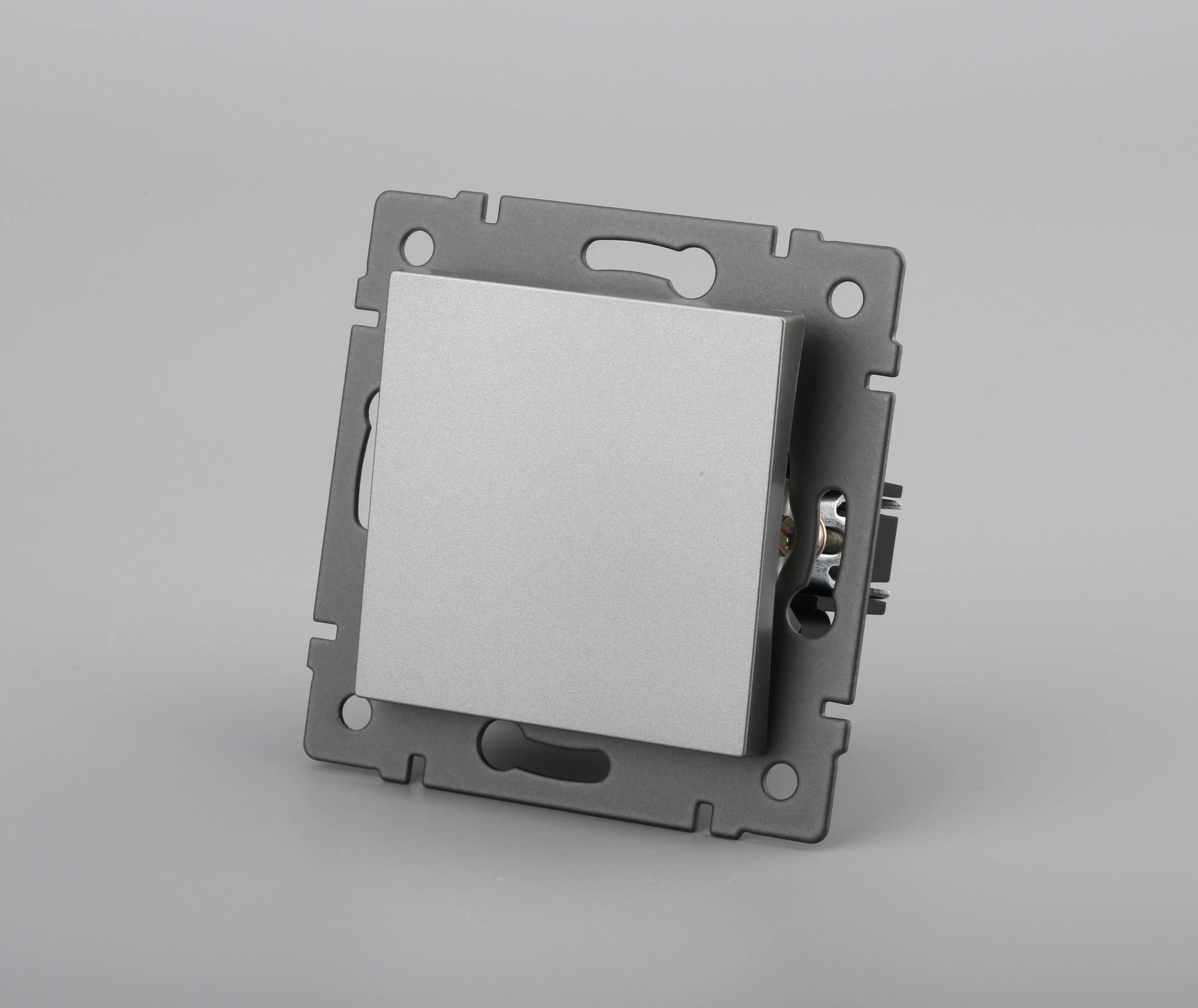 Механизм выключателя света клавишный на 1 пост 1 клавиша (перекрестный). Цвет - серый. Без фронтальной рамки. Уровень пылевлагозащиты IP20. Выключатель устанавливается в стандартный круглый подрозетник.