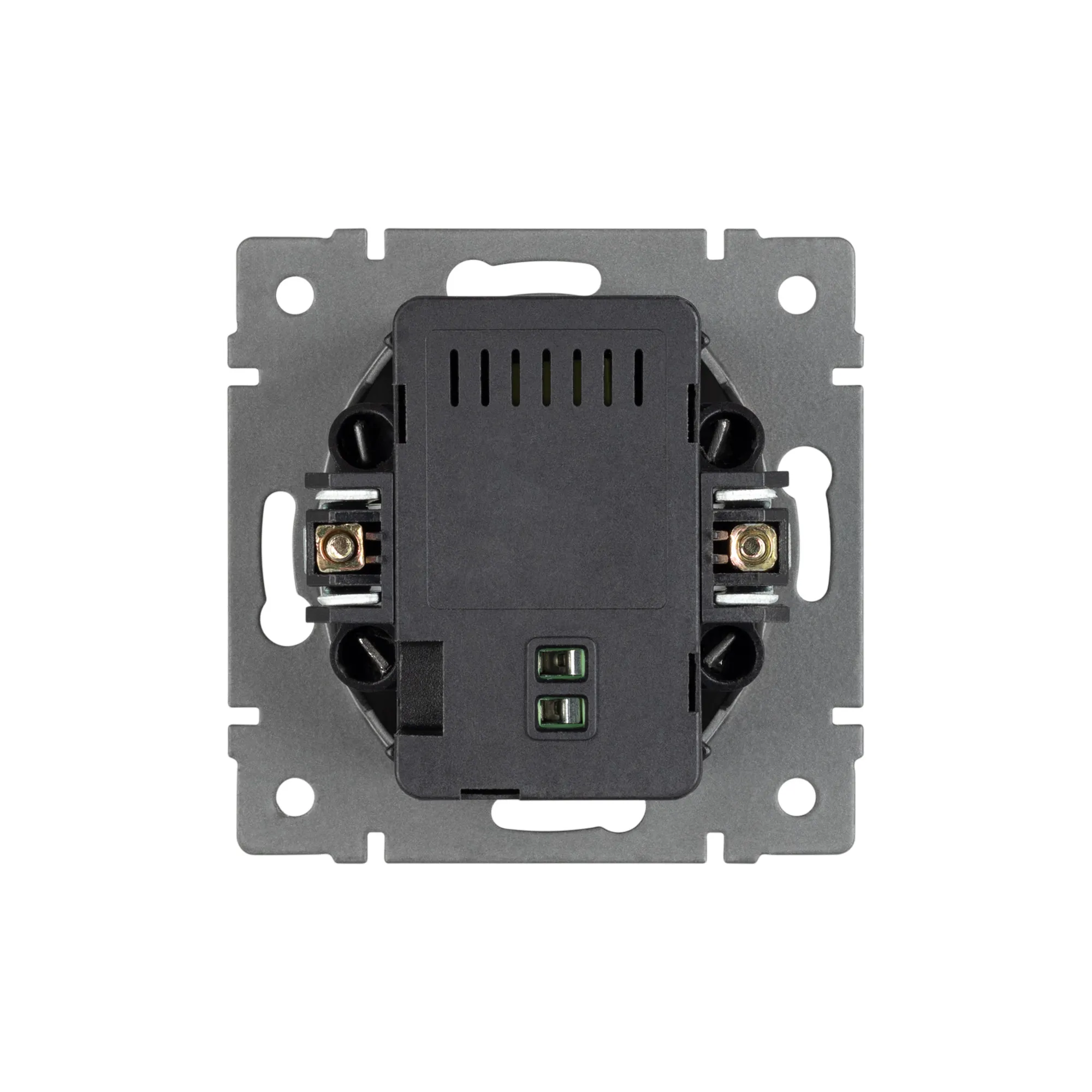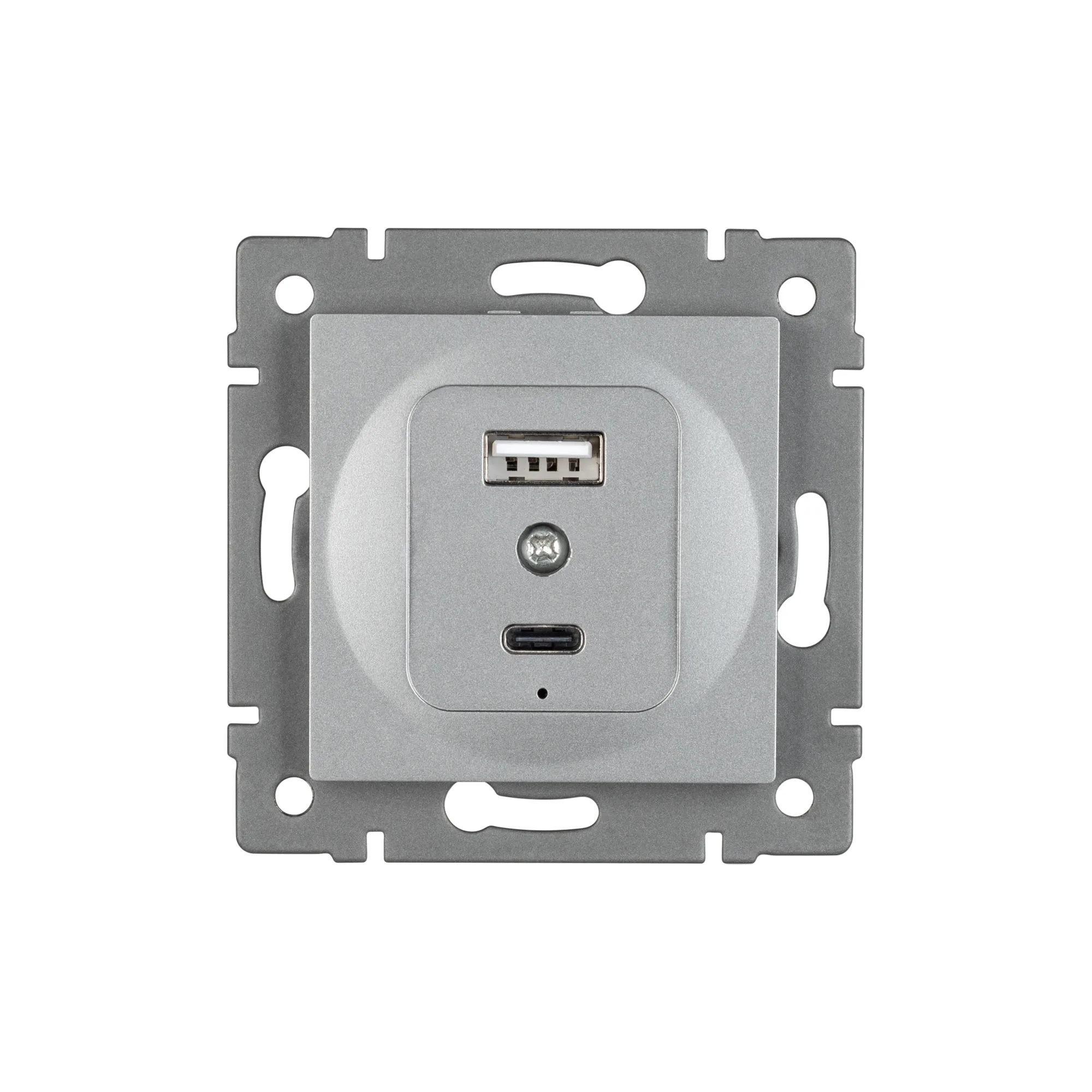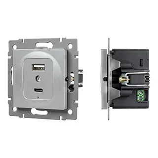 Механизм розетки с заземлением на 2 USB type A+C порта. Цвет - серый. Без фронтальной рамки. Уровень пылевлагозащиты IP20. Устанавливается в стандартный подрозетник.