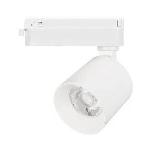 Светильник для однофазных треков, 16 Вт. Цвет свечения ТЁПЛЫЙ 3000K, световой поток 1750 лм, угол 38°, CRI>90. Корпус круглый, металл, цвет белый, IP20. Размеры Ø74x69,6 мм. Монтаж на трек 1-фазный. Входное напряжение AC220-240V, мощность 20 Вт. Драйвер встроенный (25-40V, 500 mA).Пульсация <1%.