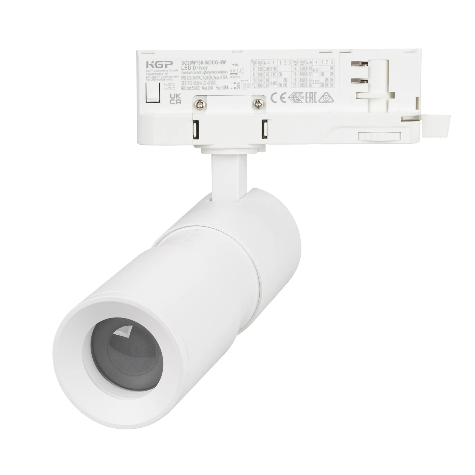 Светильник для треков/шин 4 провода с управлением DALI. Мощность 12Вт. Цвет свечения ТЁПЛЫЙ 3000K, световой поток 721 лм, 65 лм/Вт, регулируемый угол 8-80°, CRI>90. Корпус круглый, алюминий, цвет белый, IP20. Размеры L × W × H (Ø) 192 х 144 х Ø55 мм. Входное напряжение AC220-240V, Монтаж на трек 3-фазный. Драйвер 10-42В (300-800 мА), 50/60Гц, максимальная мощность 42W