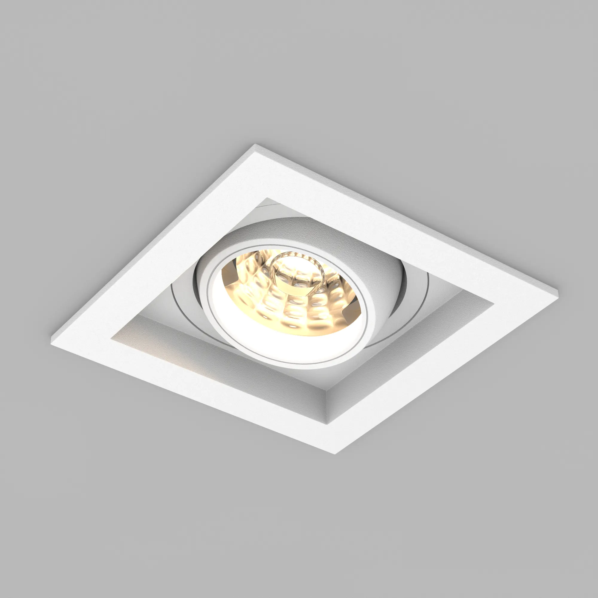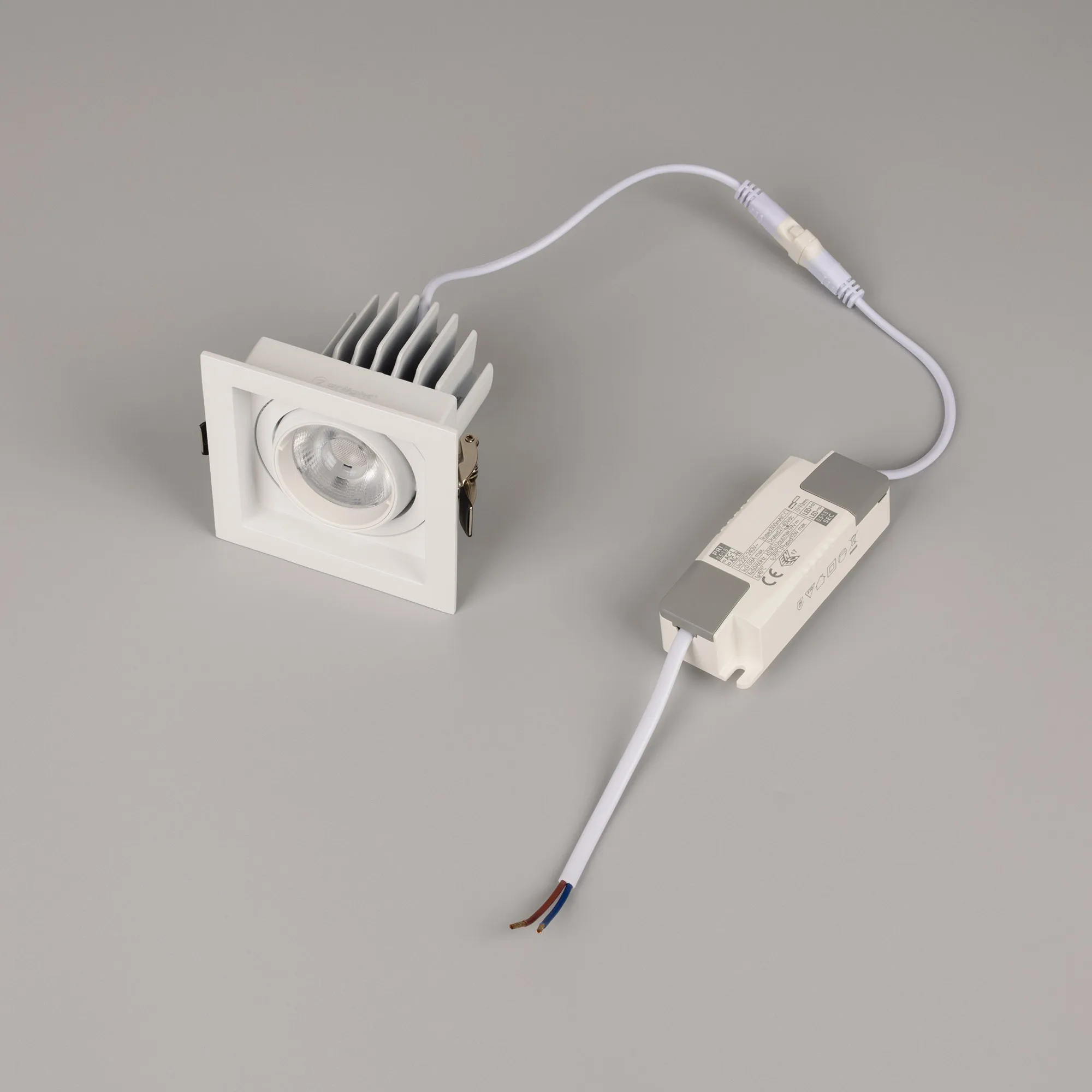 Встраиваемый карданный светильник. Мощность 12 Вт, св. поток 1394 лм, 82 лм/Вт, тёплый 3000 K, CRI>92, угол 40°, напряжение питания 230 В. Белый корпус из алюминия, белая вставка, степень защиты IP20. Размер: длина 90 мм, ширина 90 мм, высота 80 мм. Монтаж встраиваемый, установочное отверстие: длина 75 мм, ширина 75 мм. Драйвер 27-40 В, 300 мА, пульсация <2%.