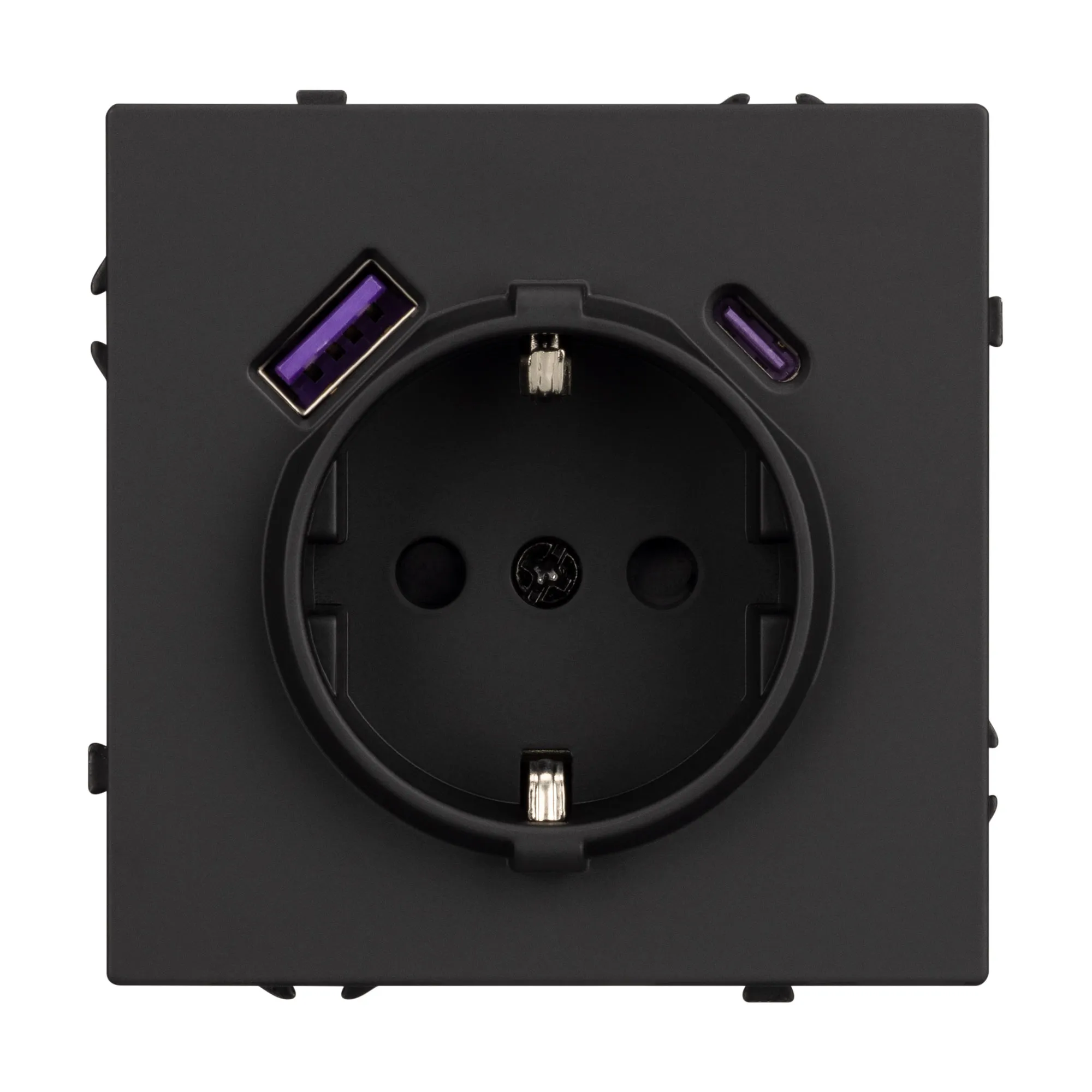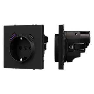 Механизм розетки с заземлением 1 пост и 2 USB Type A+C порта. Цвет - черный, с Soft-Touch покрытием. Без фронтальной рамки. Уровень пылевлагозащиты IP20. Розетка устанавливается в стандартный подрозетник круглого сечения диаметром 60мм.