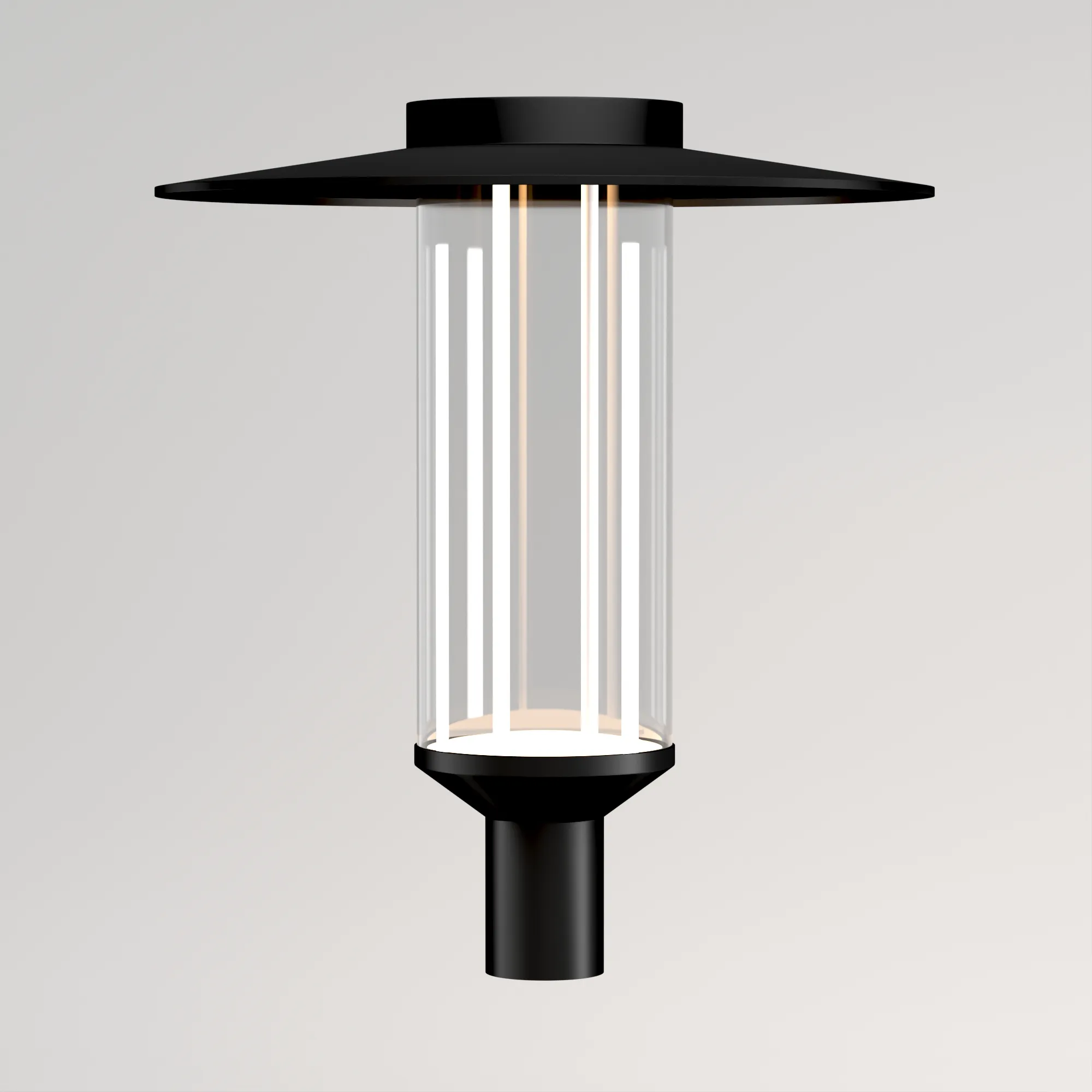 Венчающий светодиодный светильник. Мощность 50 Вт, св. поток 6330 лм, 129 лм/Вт, тёплый 3000 K, CRI>80, угол 150х30°, напряжение питания 230 В. Черный корпус из алюминия, экран закаленное стекло, степень защиты IP65. Размер: диаметр 550 мм, высота 640 мм. Монтаж на вертикальную опору диаметром 76 мм.
