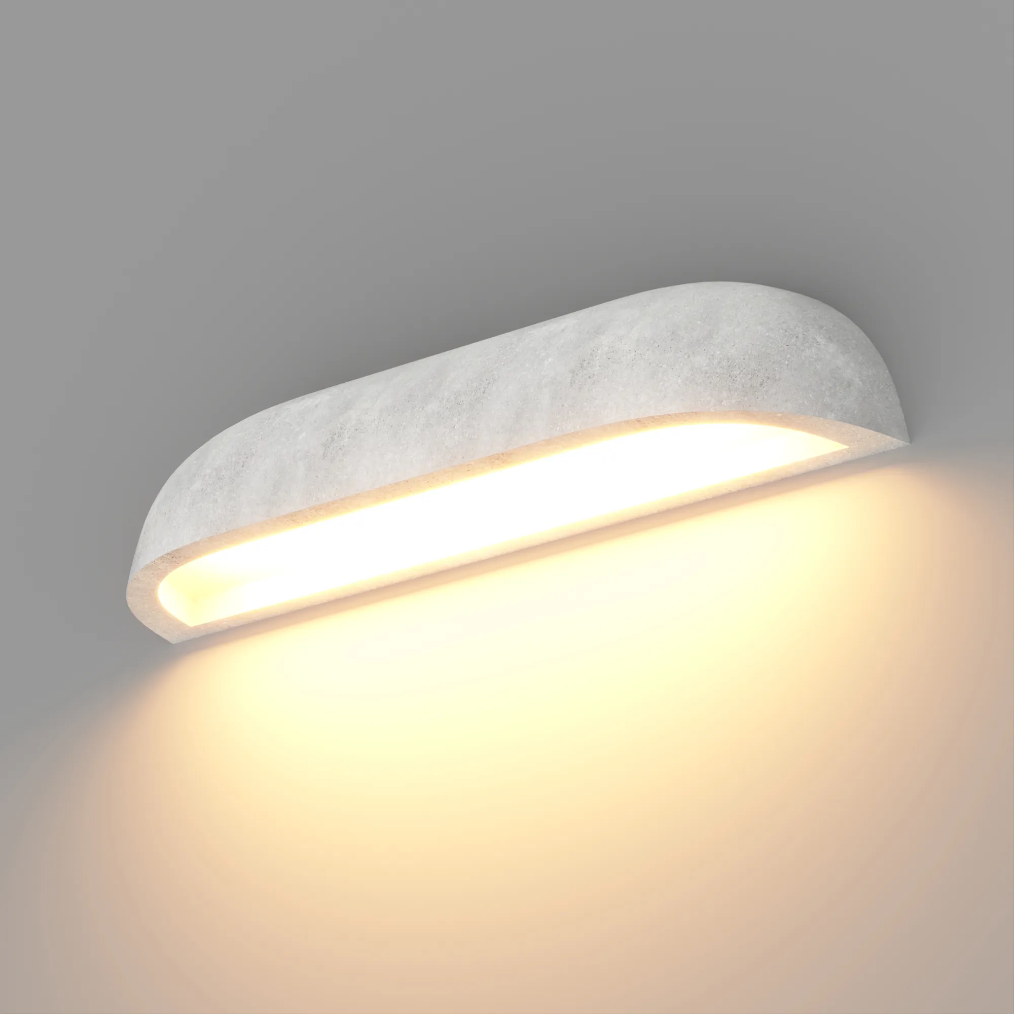 Накладной настенный светильник. Мощность 10 Вт, св. поток 726 лм, 72 лм/Вт, теплый белый 3000К, CRI>92, угол излучения 120°, напряжение питания 230 В. Фигурный белый бетонный корпус, экран ударопрочный PC, степень защиты IP 65. Размер: длина 365 мм, ширина 85 мм, высота 85 мм. Монтаж накладной. Драйвер встроенный, пульсация <0.5%.