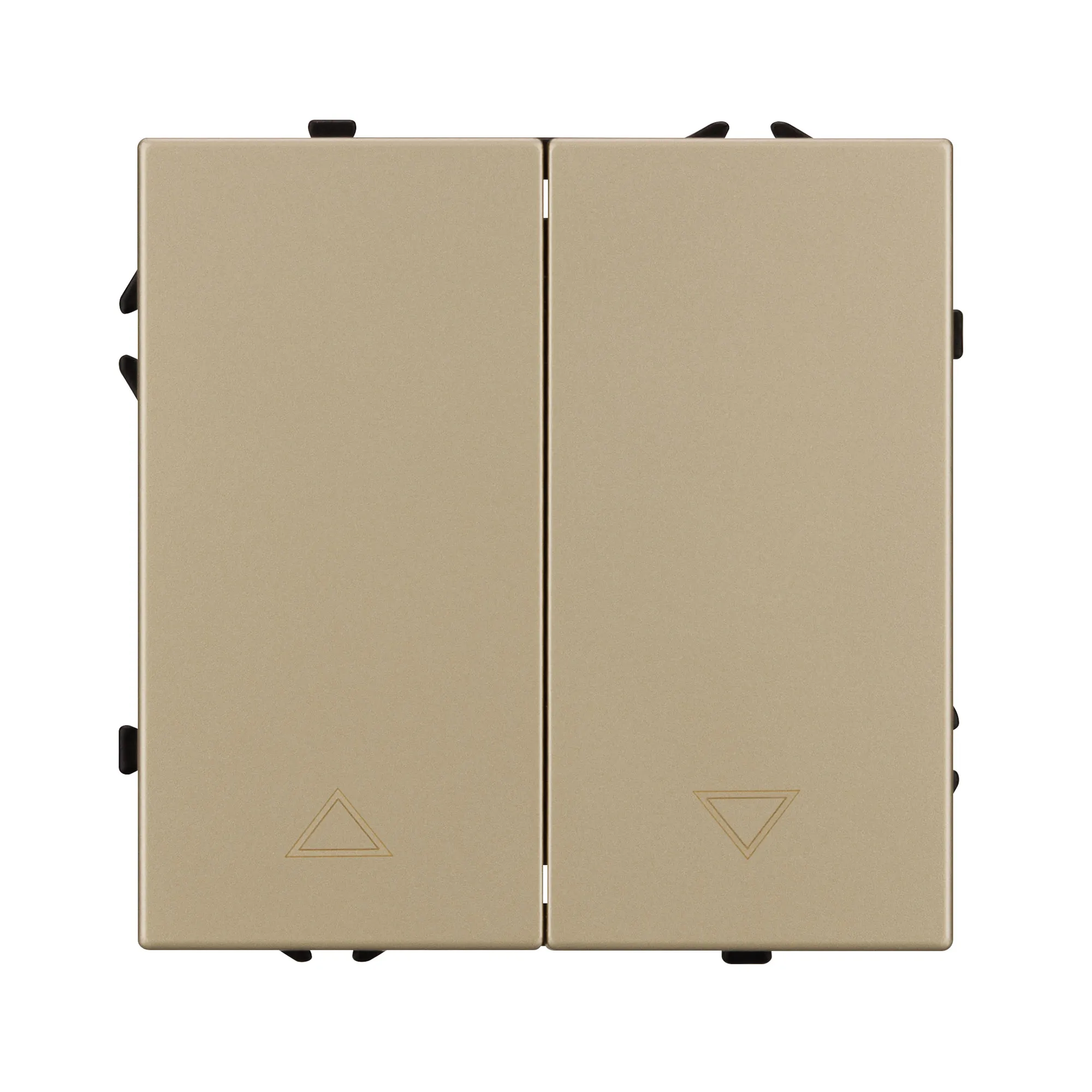 Механизм выключателя управления шторами на 1 пост 2 перекидные клавиши. Цвет - золотой, с Soft-Touch покрытием. Без фронтальной рамки. Уровень пылевлагозащиты IP20. Выключатель устанавливается в стандартный круглый подрозетник круглого сечения диаметром 60мм.